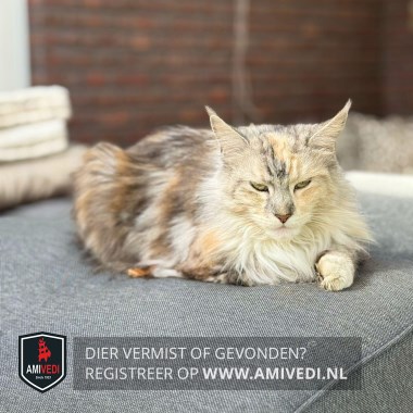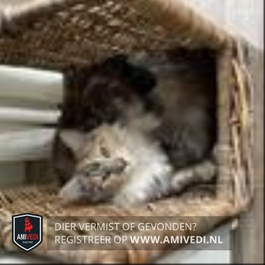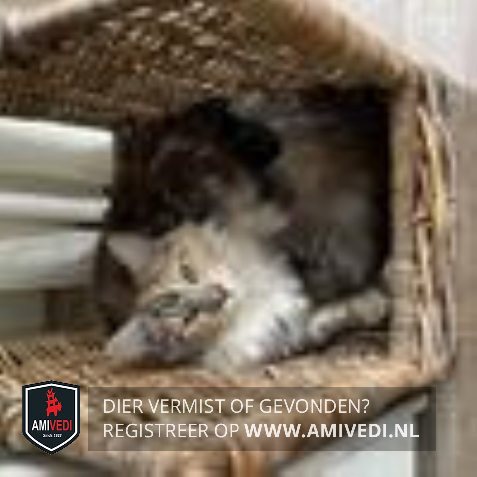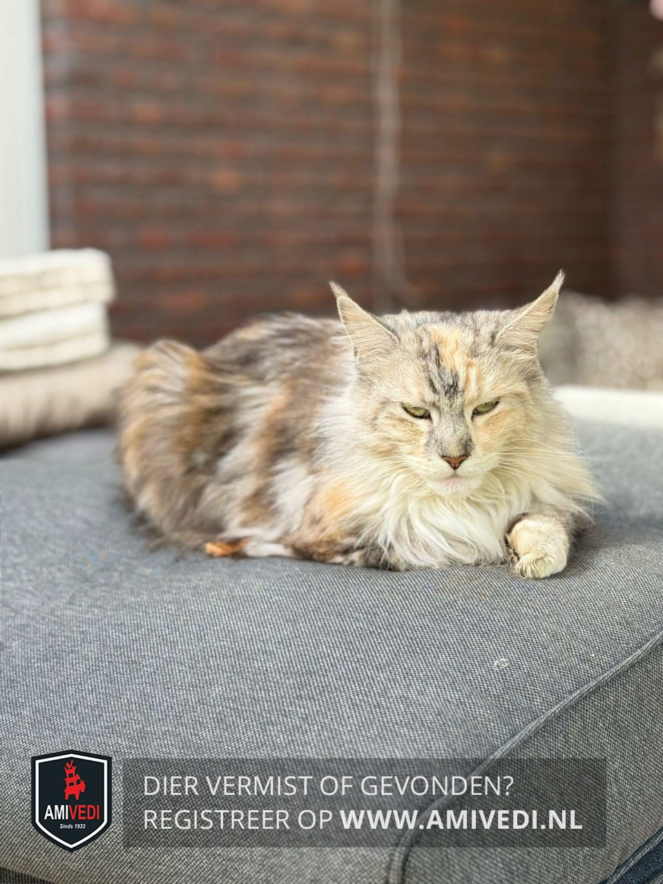 | Signalement | Cypers grijs zwart gestreept met rood en wit, Main Coon Vanaf het voorhoofd een grijs cyperse band aflopend over de neusbrug, over de rechterzijde van het kopje een rode cyperse vlek en over de linkerzijde van het kopje een cyperse rode vlek, wit kinnetje, witte borst, witte voetjes voor, lijfje gemeleerd cypers grijs met zwart gestreept en rood cyperse vlekken door elkaar. |