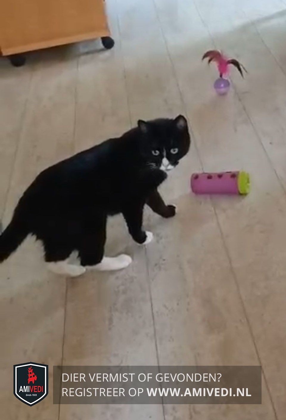 | Signalement | Zwart met wit. Wit snuitje, dun streepje tussen ogen, witte kin, bef, borst, tenen voorpootjes, sokken achterpootjes. |