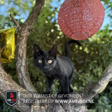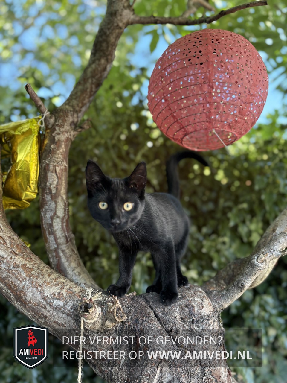 | Signalement | Zwarte poes, gele ogen, klein gebouwd. |