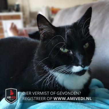 | Signalement | Zwart-witte kater. Witte snor en bef. |