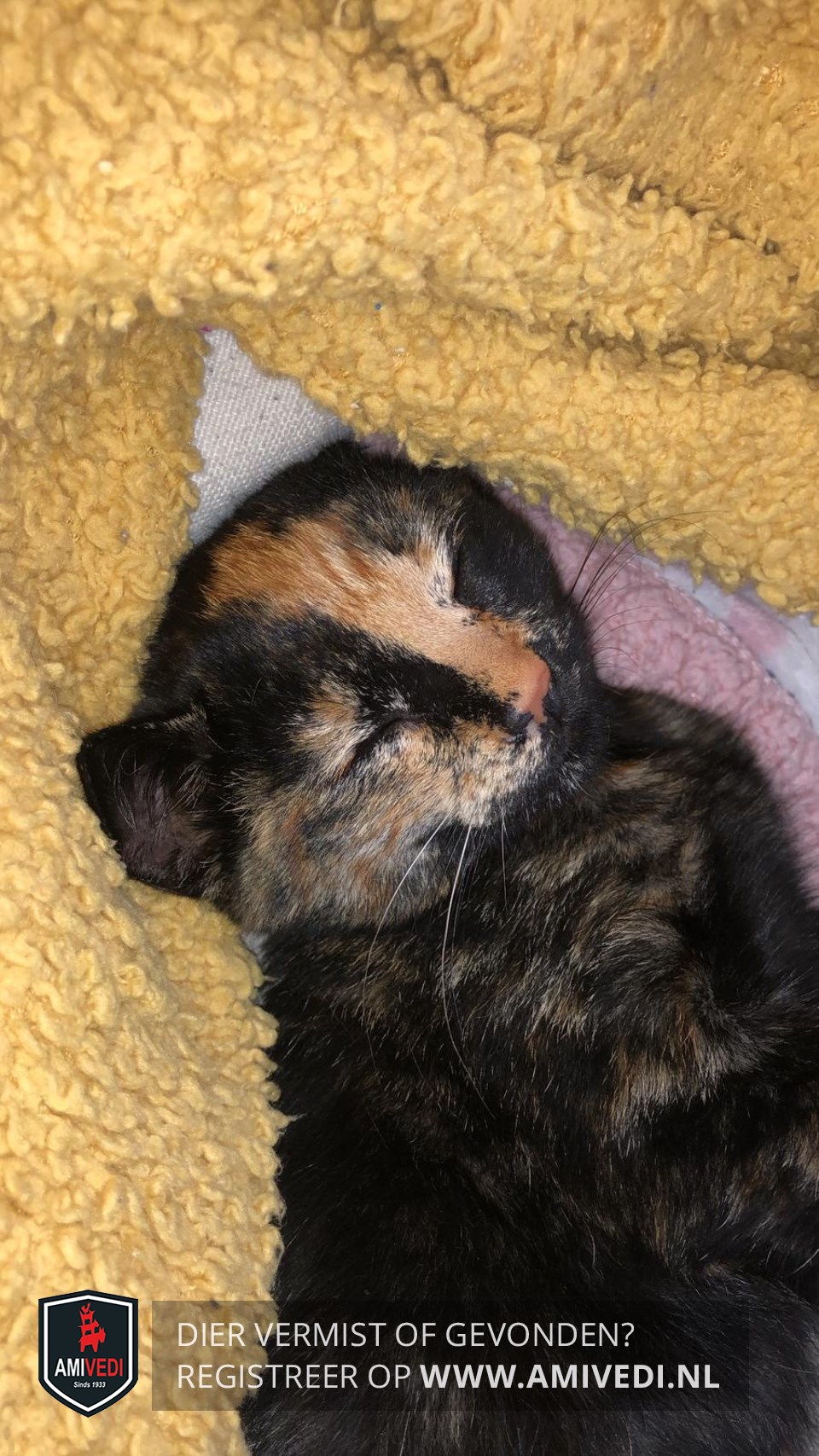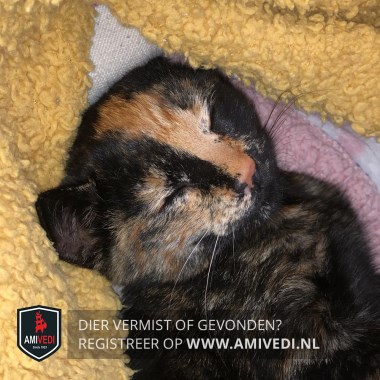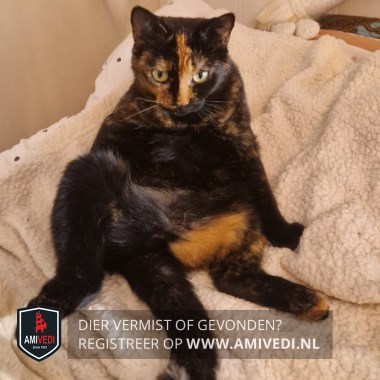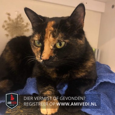 | Signalement | Zwart/rood gemêleerd. Schildpadpoes. Rechterhelft kop rossig. Rechterhelft neusbrug zwart. Linkerhelft neusbrug rood loopt door naar voorhoofd. Rechtervoorpoot rood voetje. Linkervoorpoot zwart. Op haar buik , bij haar navel heeft ze een bult. Binnenkant linkerachterpoot rood. Linkerachterpoot heeft rode teentjes. Staart zwart met lichte punt. |