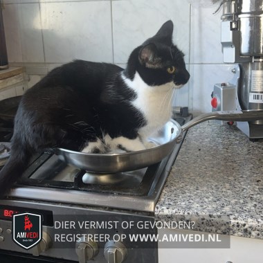 | Signalement | Egaal zwarte kitten met naast het rechteroog een wit streepje naar de snoet. Witte vlek aan de rechtersnuit en een witte bef. Witte onderkant en witte pootjes met een paar zwarte teentjes aan het rechter voorpootje. Aan de achterpootjes witte sokjes en een egaal zwart lijfje. |
