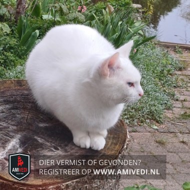 | Signalement | Geheel witte poes. Felblauwe ogen. Erg angstig. |