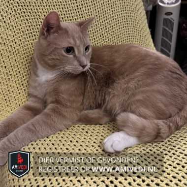 | Signalement | Cypers lichtrode kater, wat wit bij het bekje, witte bef. Linker voorpootje witte kniekous. Linker achterpootje wit sokje. |