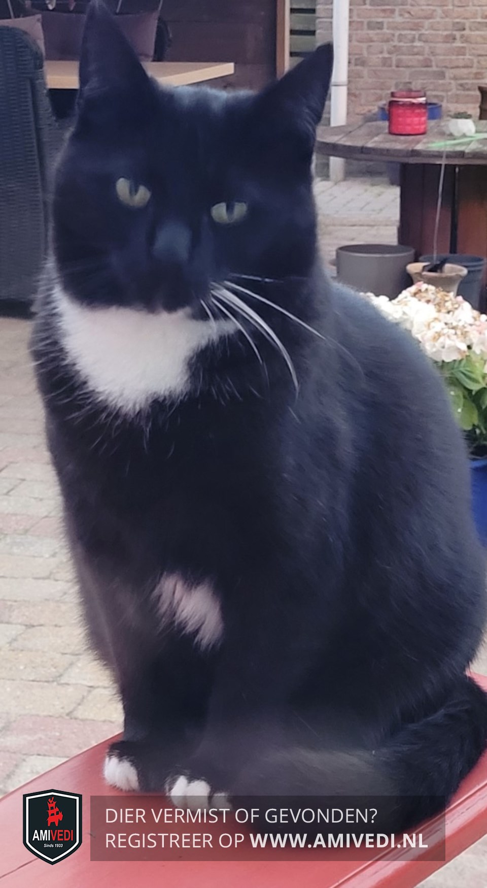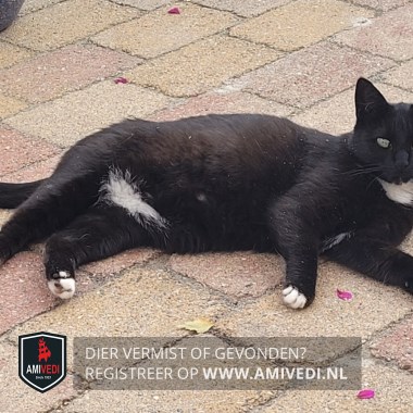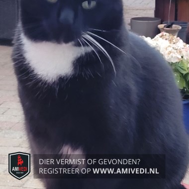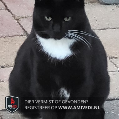 | Signalement | Zwart met witte kin en bef. Snorharen links wit, rechts zwart. Wit vlekje op borst en wit onderaan buik. Achterpoten witte voetjes, voorpoten witte teentjes. |