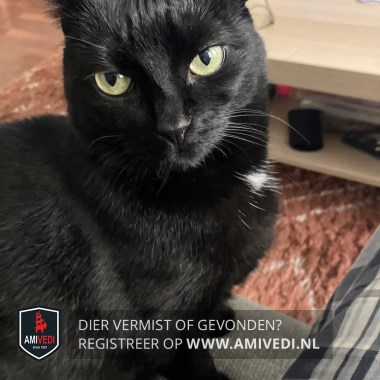 | Signalement | Egaal zwarte poes met een klein wit vlekje op de bef, groene ogen. |