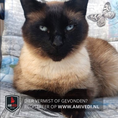| Signalement | Beige met bruin en een zwart masker, blauwe ogen, zwarte oren en zwarte pootjes. is net geopereerd heeft een wond in de nek. |