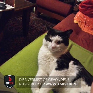 | Signalement | Wit met zwart naast de ogen, op kopje en op oren, zwart op rug en zwarte staart, wondje rechts naast neus bij de snorharen. |