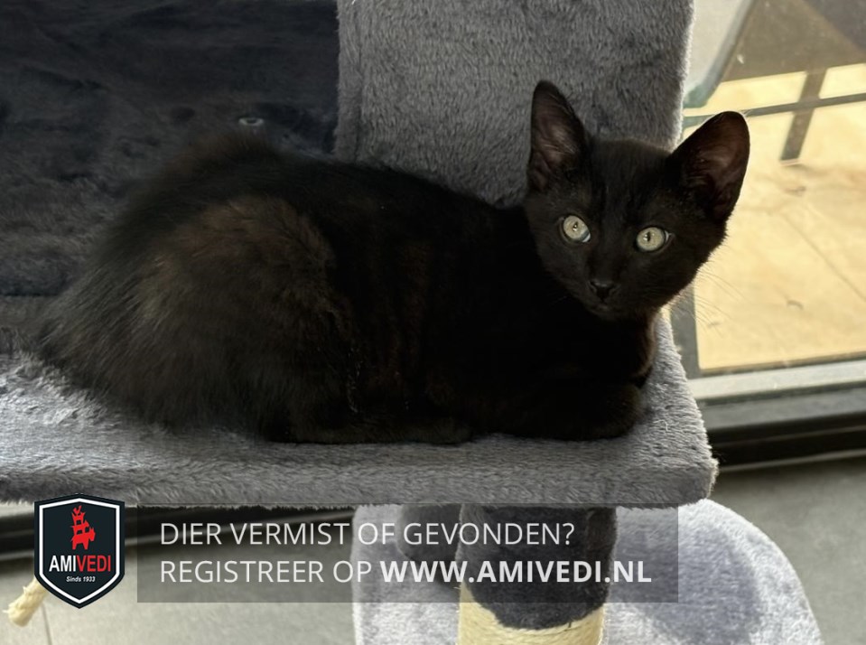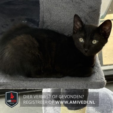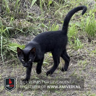 | Signalement | Geheel zwarte kortharige jonge kater, makkelijk aan te halen of mee te nemen. |
