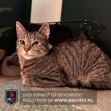 | Signalement | Cypers bruin/grijze kater, wat beige rond het bekje en op de kin. |