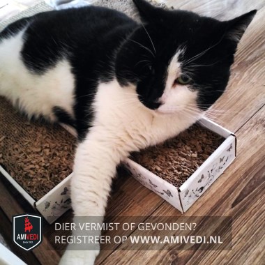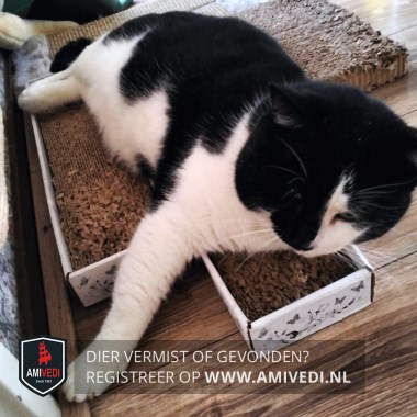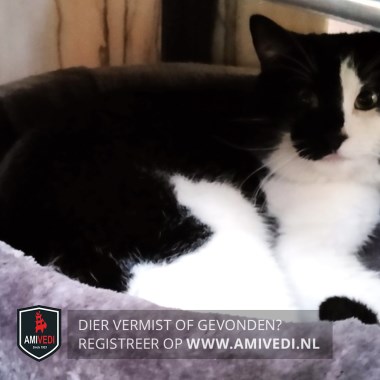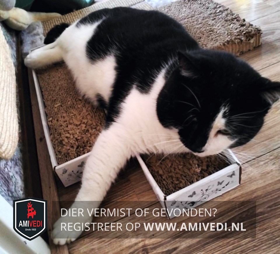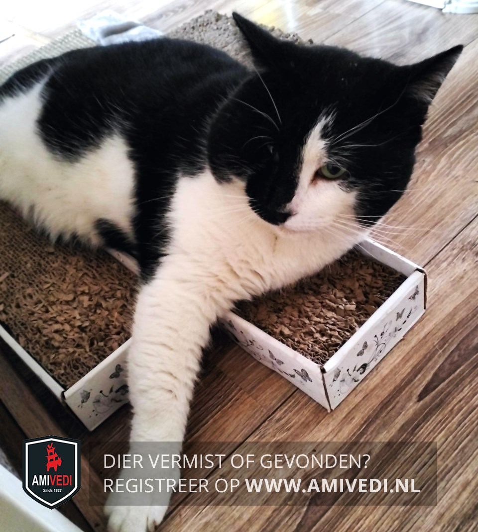 | Signalement | Zwart met wit. Kop meest zwart, links op het voorhoofd wit half doorlopend over het oog en neus, linkerwang en snoet wit, rechterwang, neus en snoet zwart, neusje half zwart half roze, kin wit, hals en borst wit doorlopend naar nek en onderkant, voorpoten wit, zwarte vlek achterkant rechter voorpoot, rug zwart loopt in golven over de flanken, onderlijf wit, achterpoten wit, staart zwart. Niet heel groot, wel stevig gebouwd. |