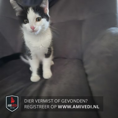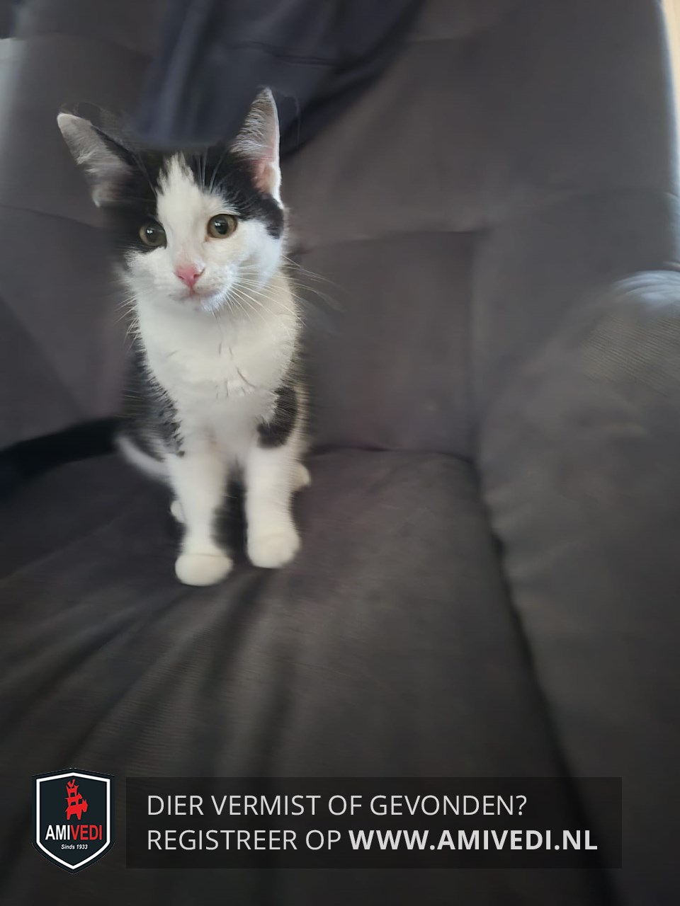 | Signalement | Kleine zwart witte poes heeft een wond op haar buik van haar sterilisatie. WItte snuit, zwart tot over rechteroog, wit om het linkeroog. Witte voorpoten, witte buik. |