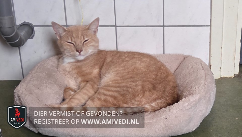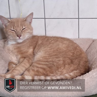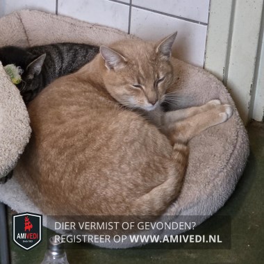 | Signalement | Rood/oranje cyperse kater. Cypers gestreept kopje, lichter rondom het bekje. Witte kin en witte bef. Rood/oranje gestreept lijf en pootjes. Voorpootjes hebben witte teentjes. Geringde staart. |