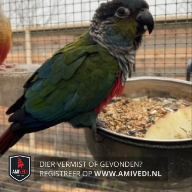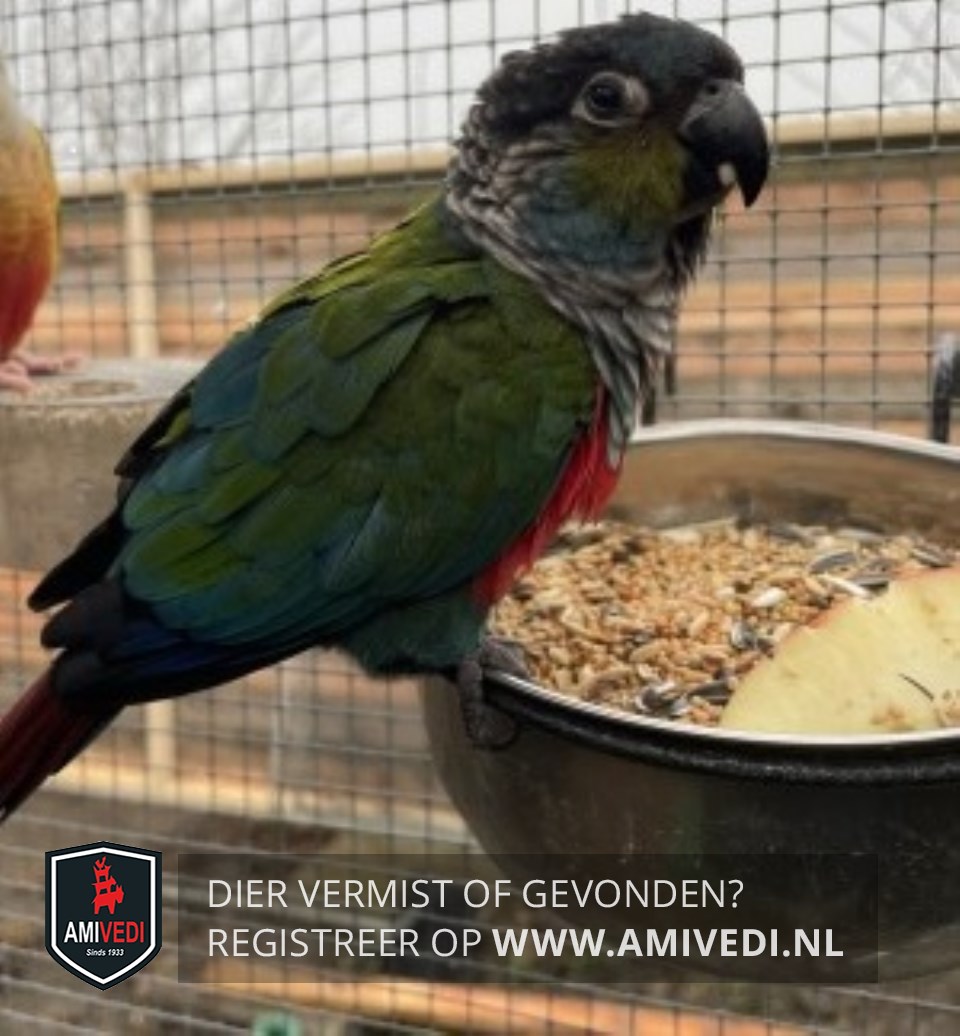 | Signalement | Hij heeft overwegend groene veren op rug en vleugels, met duidelijke blauwgroene tinten in de vleugelpennen. De borst en buik zijn rood, wat sterk contrasteert met het groen. Zijn kop is donkergrijs tot zwartachtig, met een schubachtig patroon op de hals en borst, en hij heeft een donkere, gebogen snavel. Rond het oog is een lichte oogring zichtbaar. De staart is lang en donkerrood. |