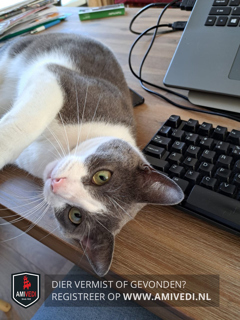 | Signalement | Grijs kopje tot over de ogen. Witte bles en snuitje. Witte nek, hals, borst en buik. Grijze rug. Witte pootjes. |