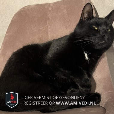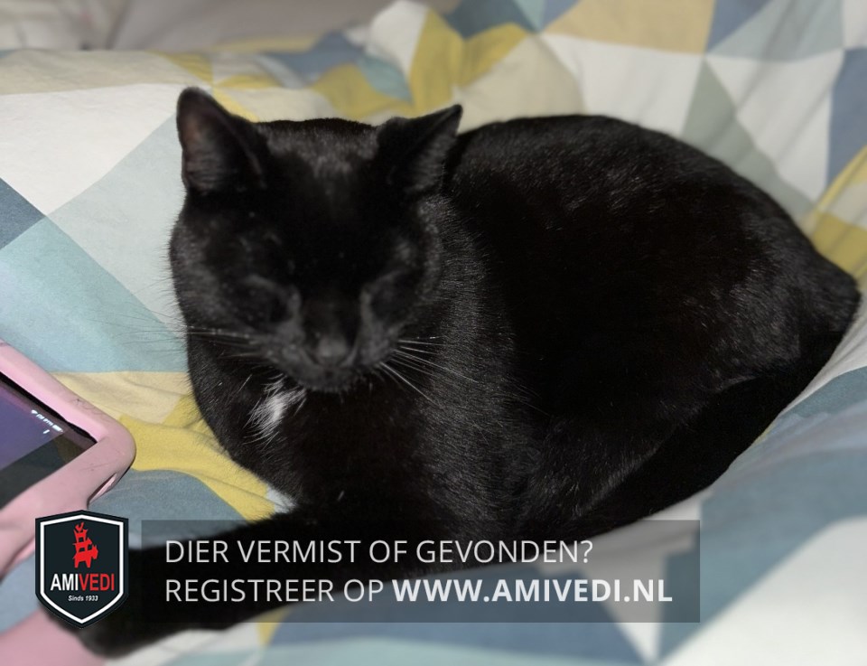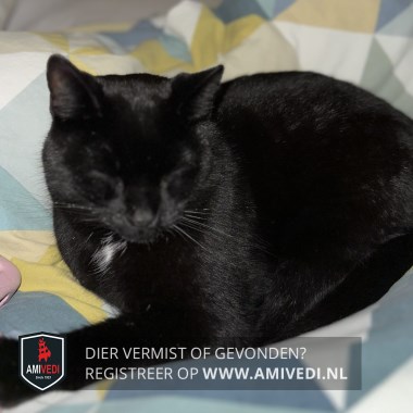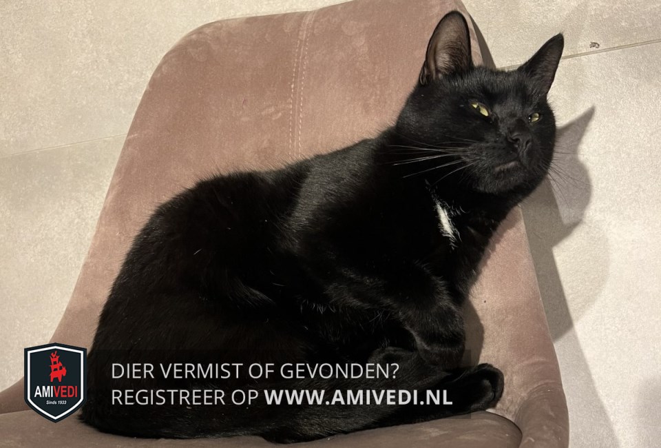 | Signalement | Geheel zwart met een klein wit plukje op de bef, gele ogen. |