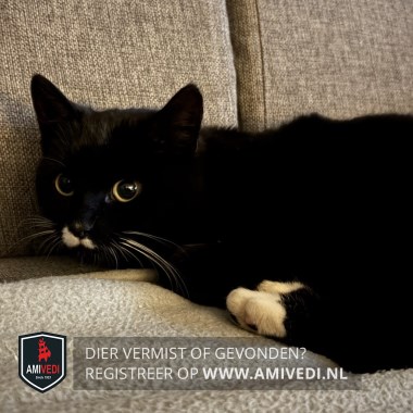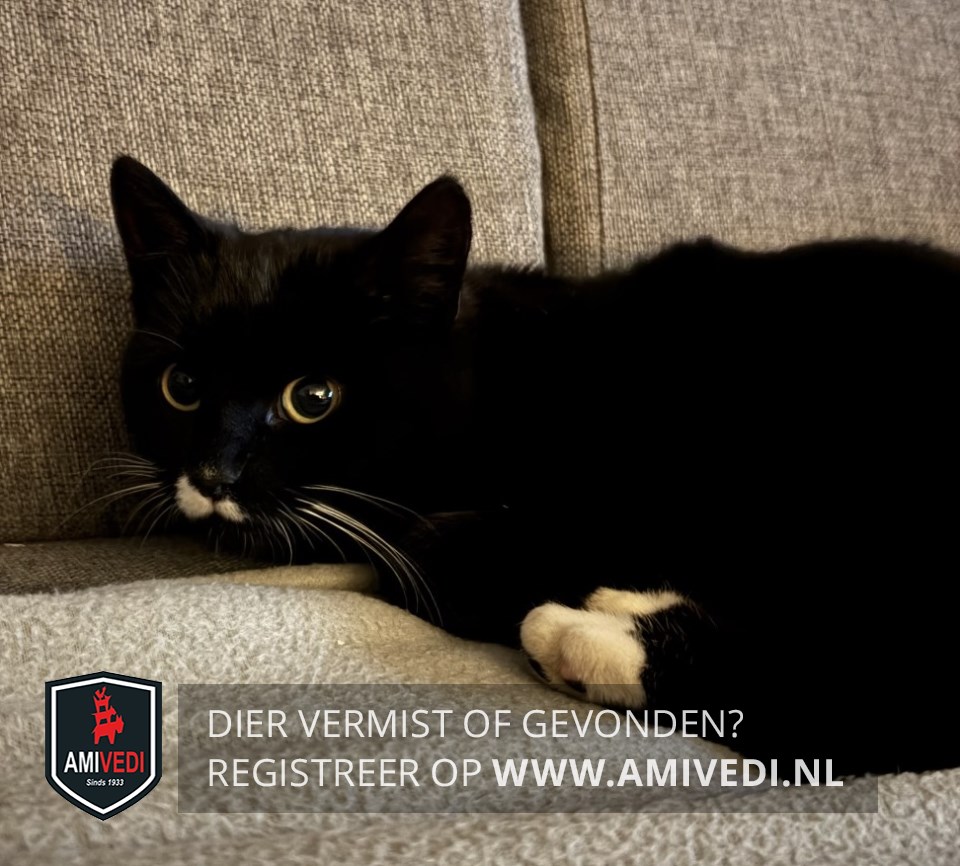 | Signalement | Kleine zwart met witte kat. Witte snor, rechts groter dan links. Witte snorharen en witte voetjes. Heeft geen staart. |