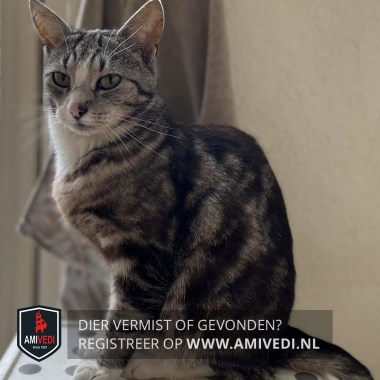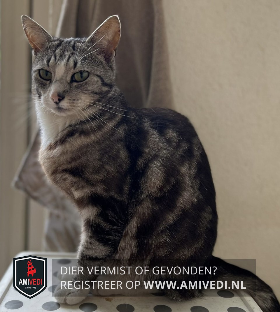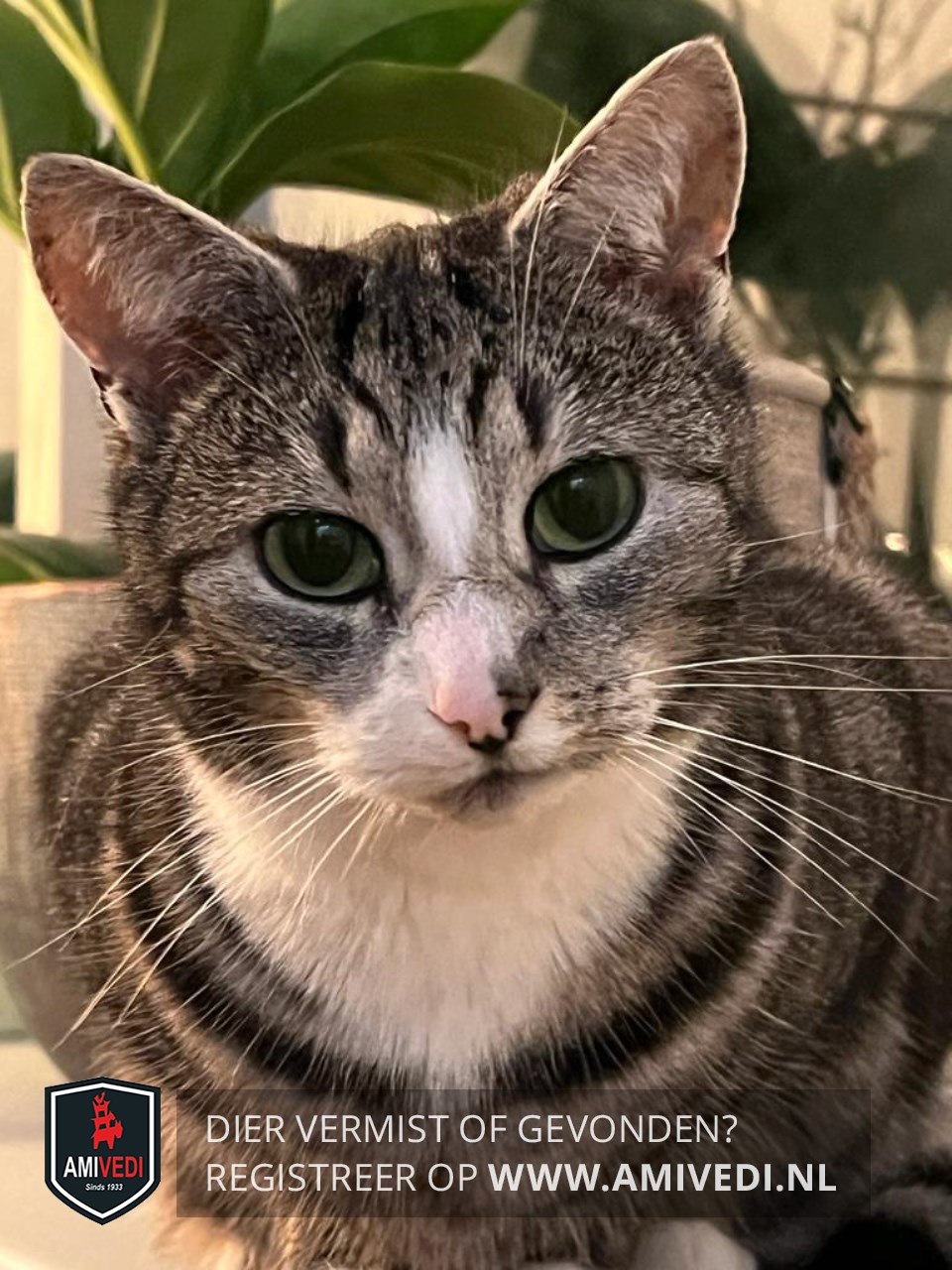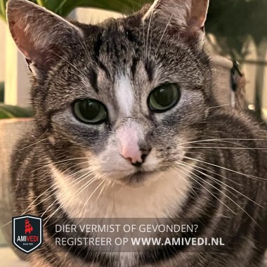 | Signalement | Niet heel grote poes met een beetje wit op de bles. Rechts bij de snorharen wit, links bij de snorharen een klein wit vlekje. Grijs-witte kin, witte bef. Neusje is grotendeels roze met een beetje grijs aan de linkerkant. Linker voorpoot heeft een wit voetje, andere 3 pootjes hebben ook wit. Brede zwarte strepen op het lichaam. |