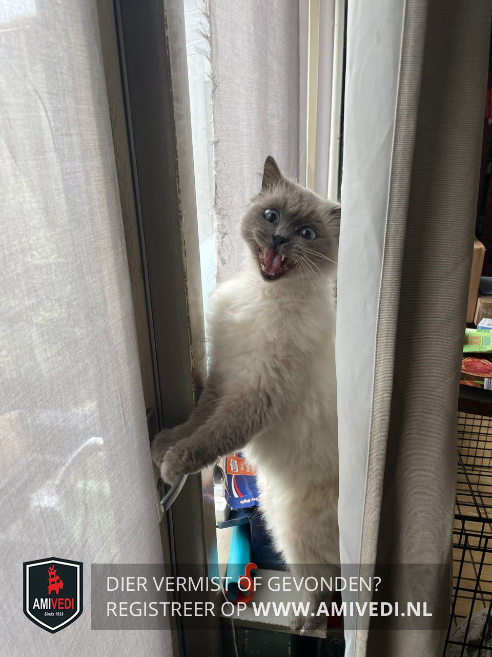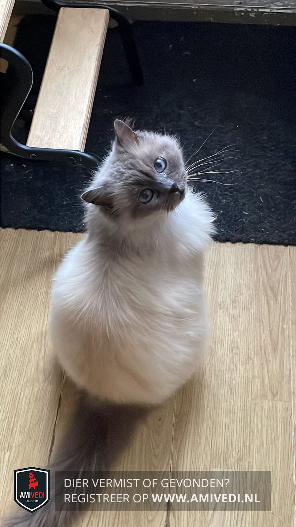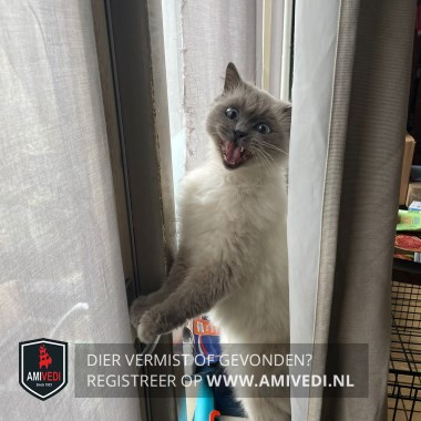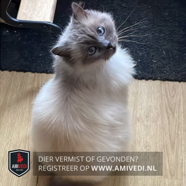 | Signalement | Witte/ beige vacht met grijs en blauwe ogen en een grijze snuit( blue Point) Grijs aan de pootjes. |