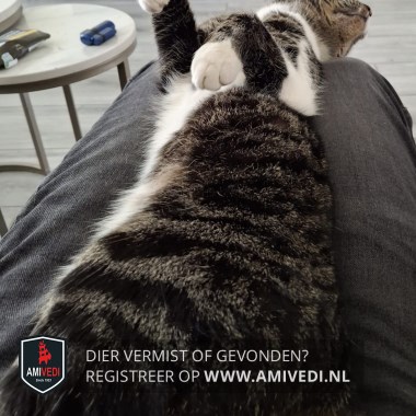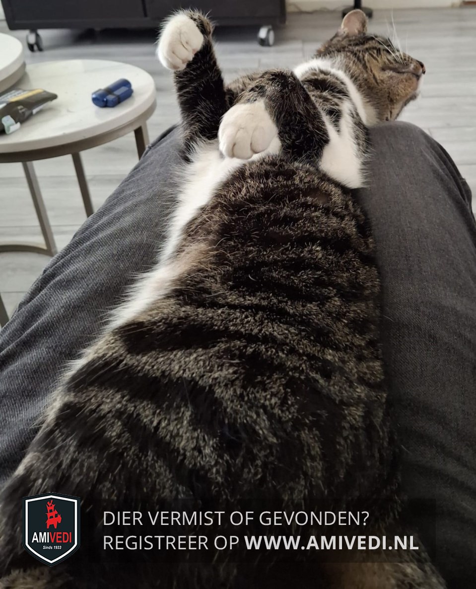 | Signalement | Cypers grijs/zwart/bruin gestreept met wit op de borst. In ieder geval wit op zijn linker elleboog. In ieder geval witte voetjes aan zijn voorpoten en wit op zijn buik |