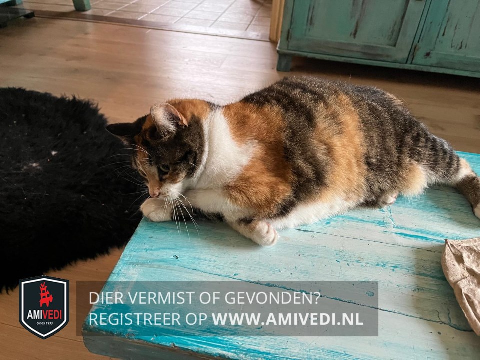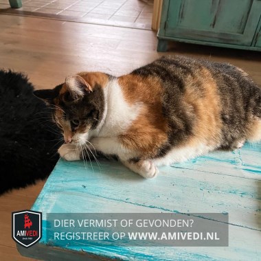 | Signalement | Bruin petje, cypers bruin/rode rug. Op de linker voorpoot aan de achterkant een bruine vlek en op de linker achterpoot aan de voorkant een bruine vlek. Rode bles en kraag. Wit onder de neus, kin bef en borst en buik. het lijkt erop dat de rechter voorpoot ook een bruin vlekje heb. |