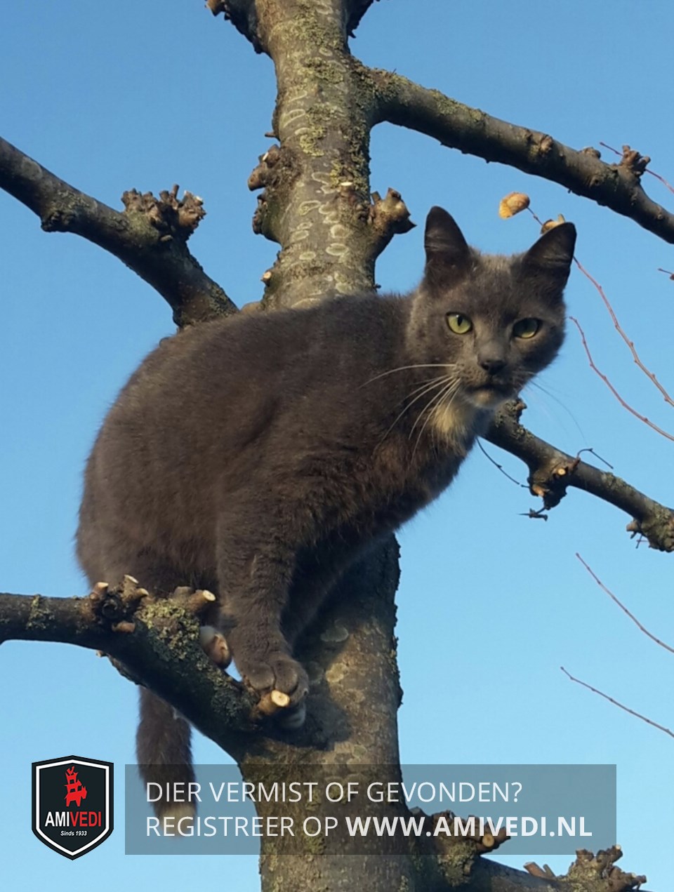 | Signalement | Grijs met witte bef, witte teentjes, wit puntje aan zijn staart. |
