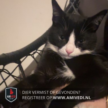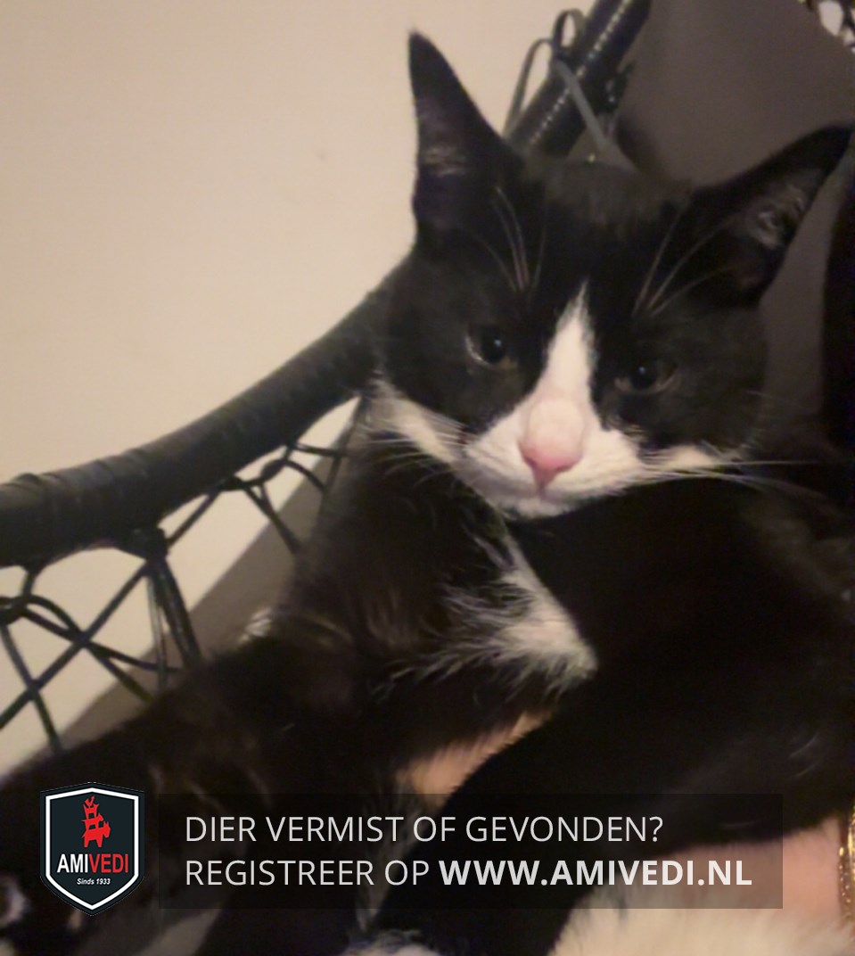 | Signalement | Zwart/witte kater. Bijna geheel zwart, wit neusje, wit rond het bekje, wat wit op de wangen en op de borst. |