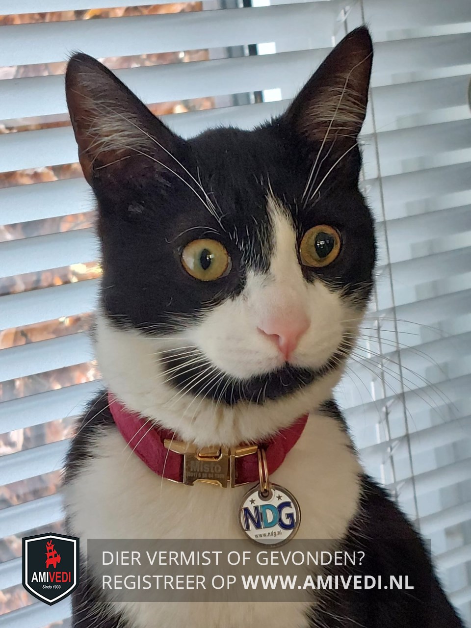 | Signalement | Misto heeft een rode halsband om met zijn naam en telefoonnummer. Hij heeft een zwarte onderkin en een zwarte vlek op zijn linker achterpootje. |