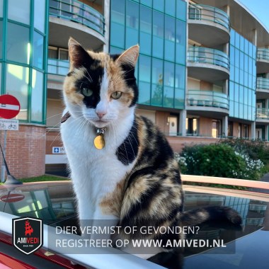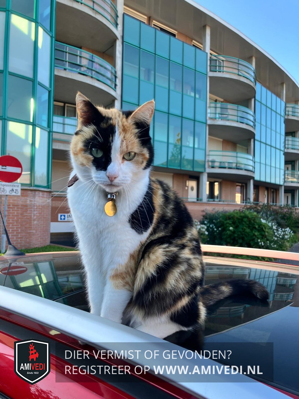 | Signalement | Lapje/schildpadje. Zwarte vlek rechteroog. Rode vlek linkeroog. Neus, mond, kin, bef, borst en buik wit. Voorpoten wit. Bruine halsband met een gouden penning. |