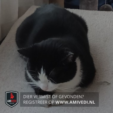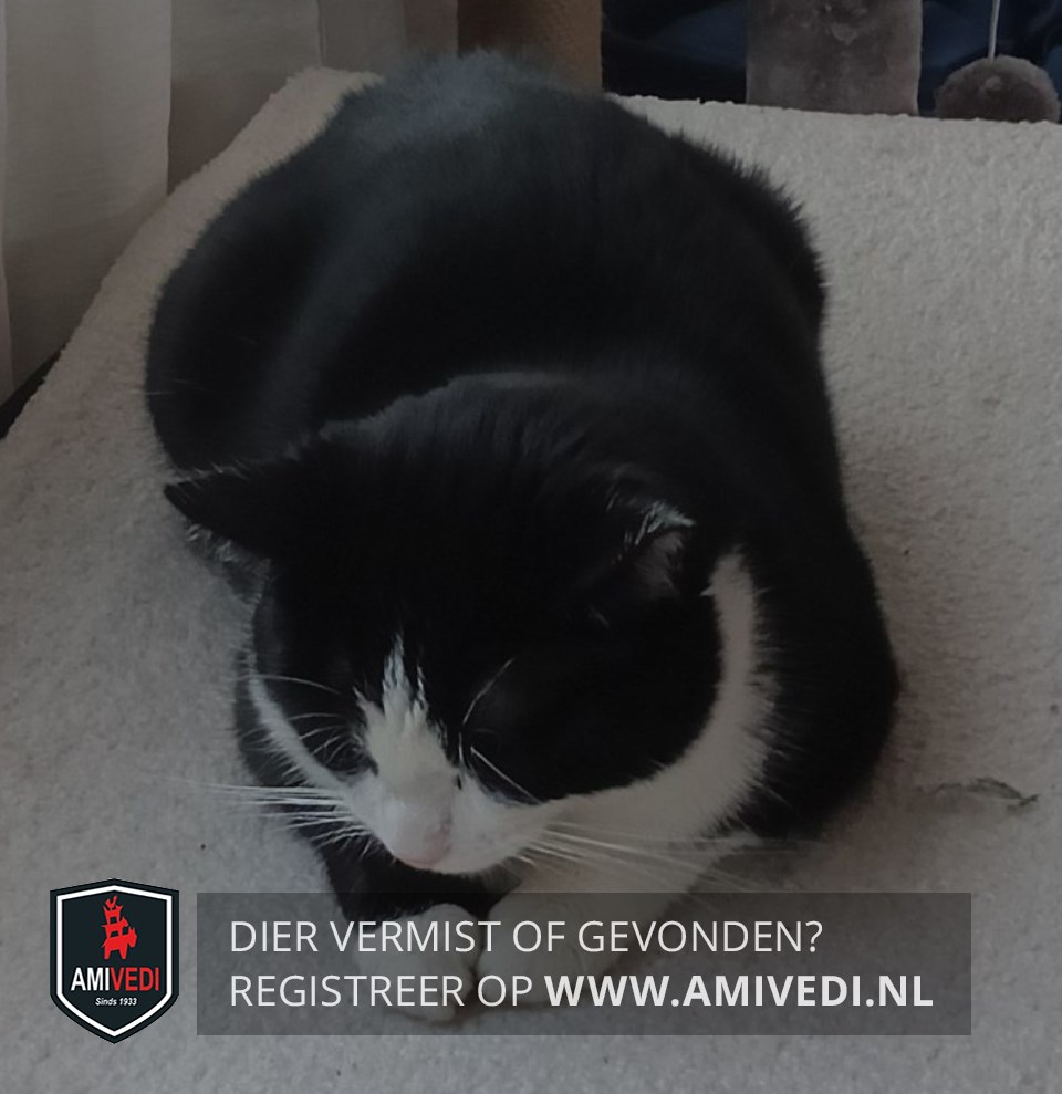 | Signalement | Zwarte kop, rug, staart, pootjes, witte bles, bef, borst en voetjes. |