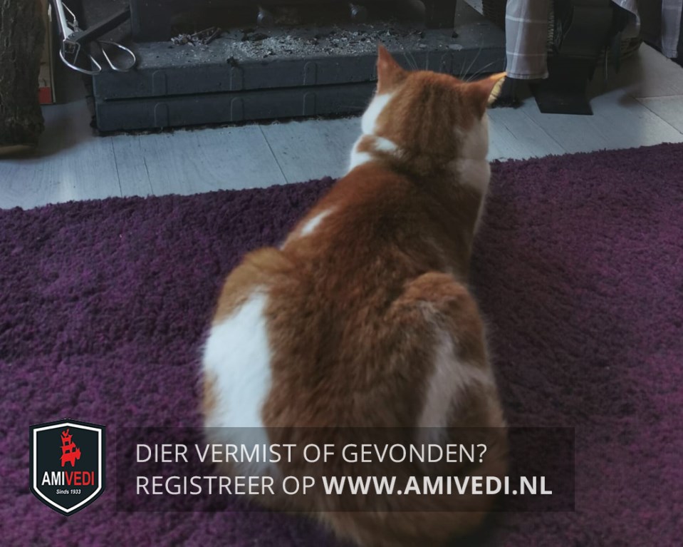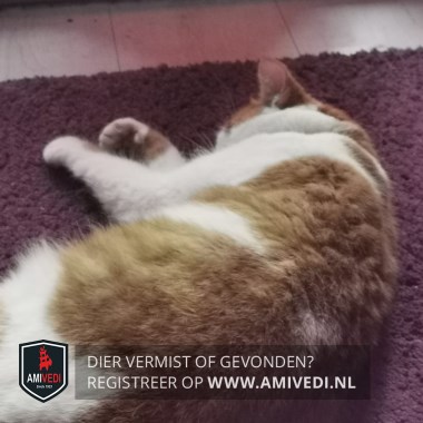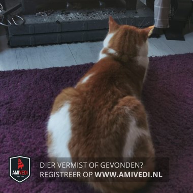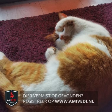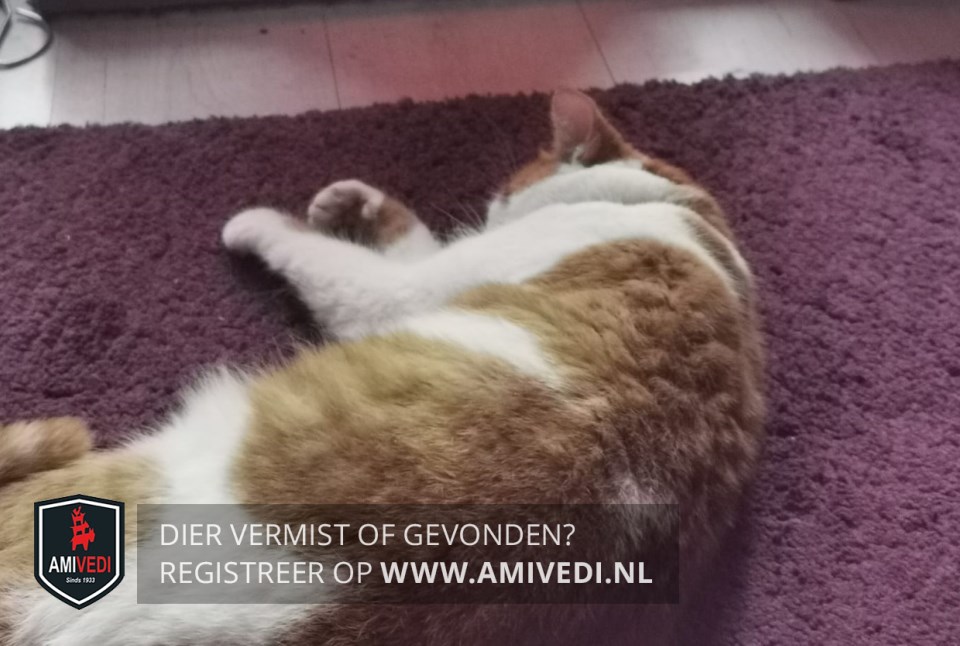 | Signalement | Rood/oranje (gestreepte) kater met wit, rode oren, rode kin, witte borst en buik, rode rug met witte vlek, witte voeten voorpoten met rode vlek rechtervoorpoot en witte voeten achterpoten, halsband met paars label met de naam Poes en telefoonnummer. |