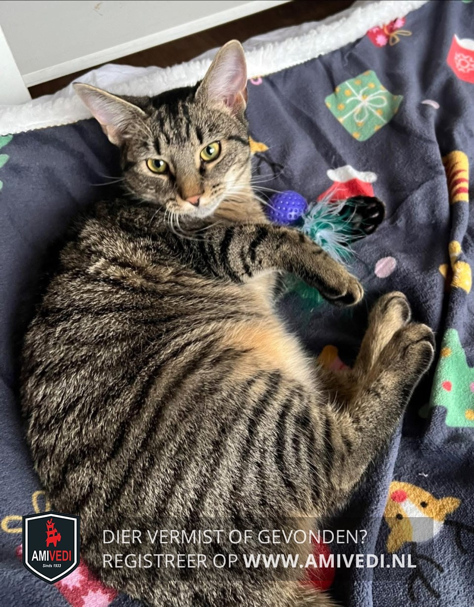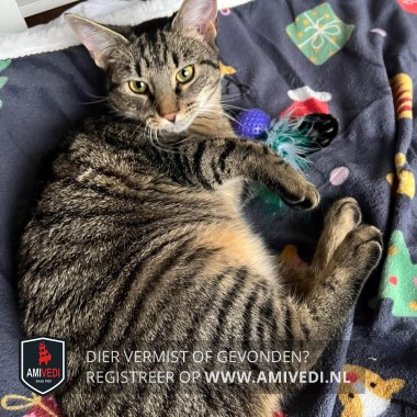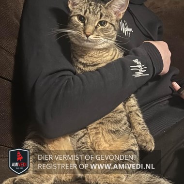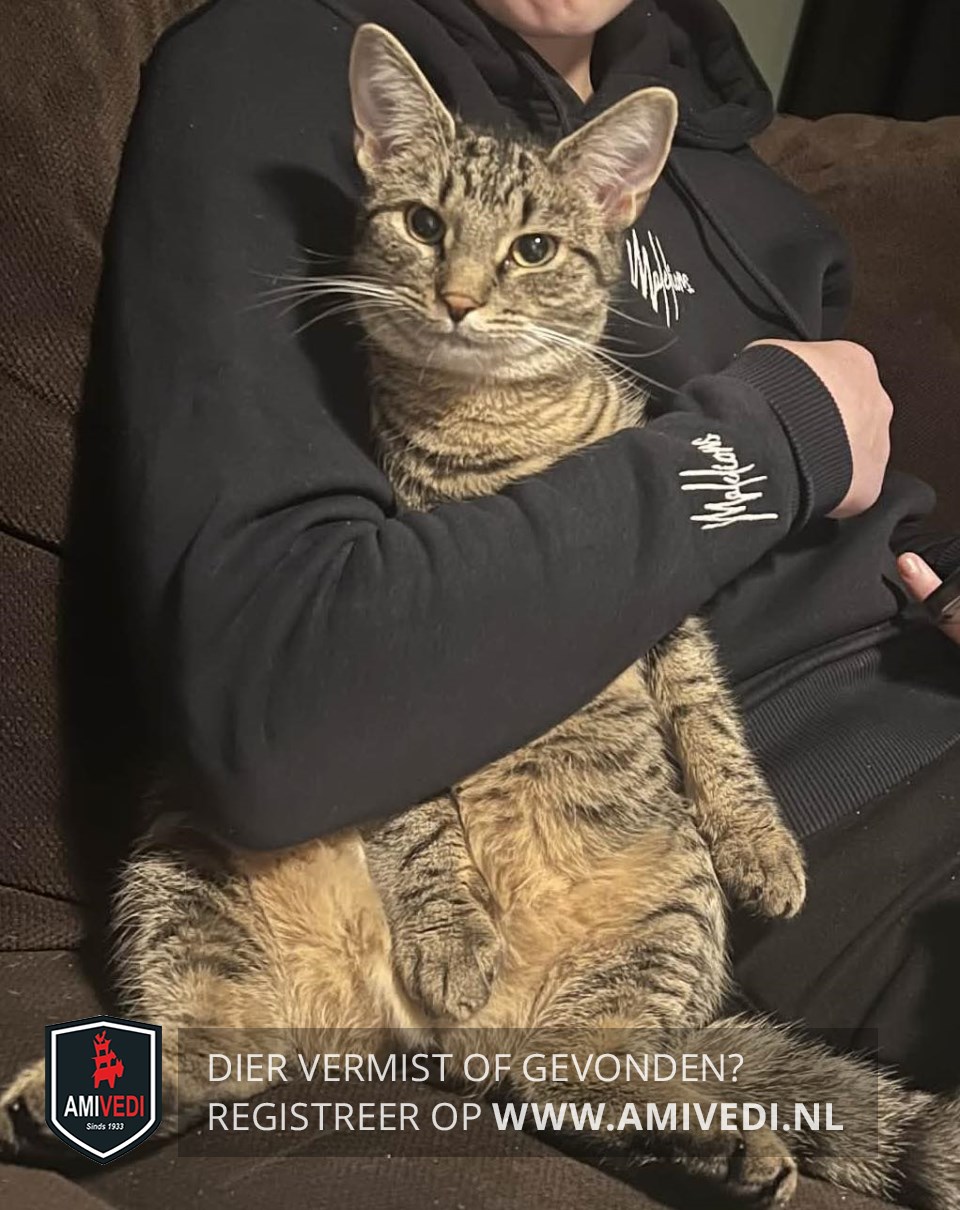 | Signalement | Cypers bruin/beige/zwart gestreept met een lichte kin. |