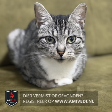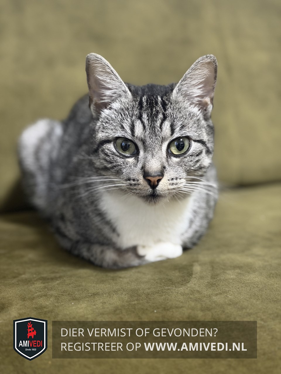 | Signalement | Cypers grijs/bruin/zwarte poes, wat wit bij het bekje, witte bef. |