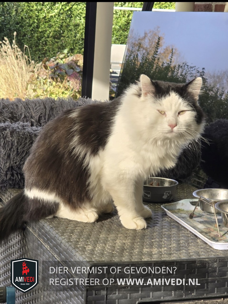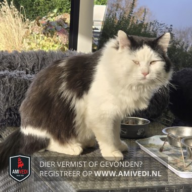 | Signalement | Poes poes is grotendeels wit en met zwart. Rondom de oren is het zwart, grote zwarte vlekken op de rug en een zwarte staart. Gele ogen. |