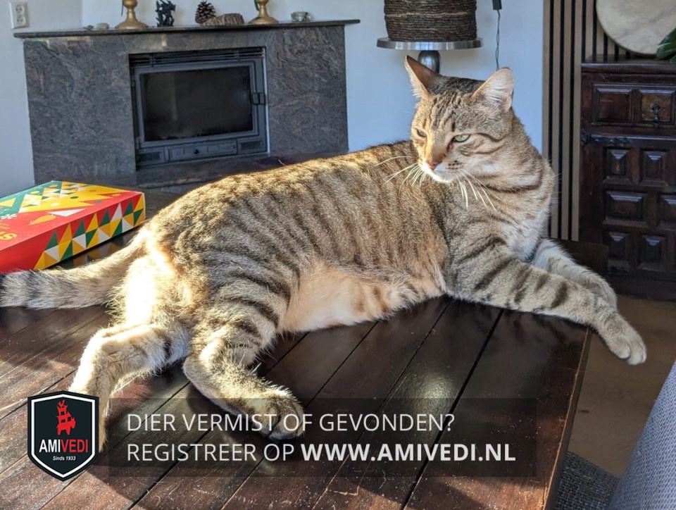 | Signalement | Cyperse kat met een zwart, bruin gestreept patroon, zijn kin en buik zijn lichtgrijs, volslank,, korte vacht met een lange slanke staart. |