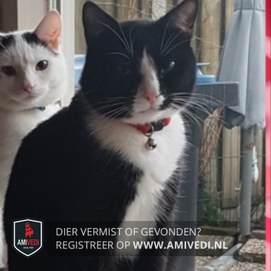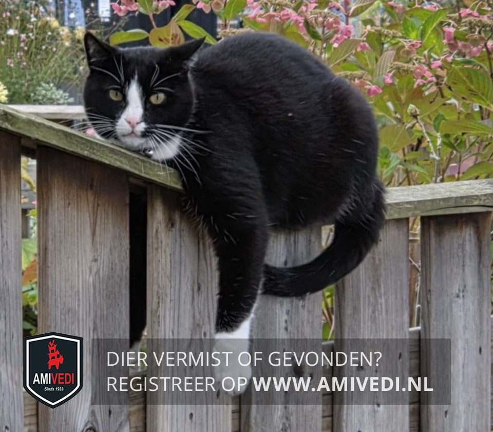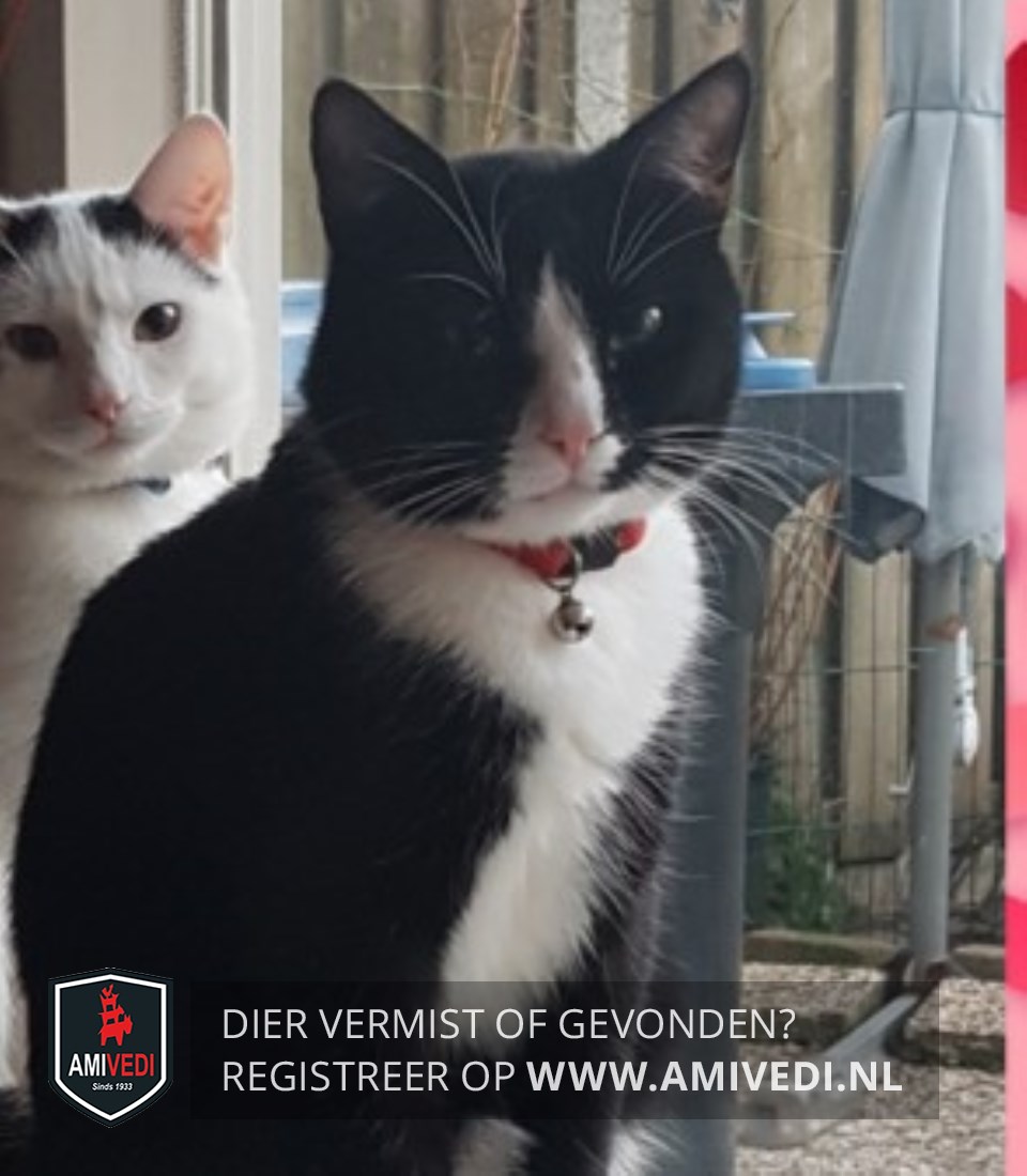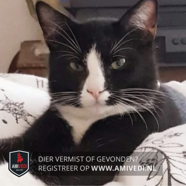 | Signalement | Zwart/witte kater. Voornamelijk zwart. Wit neusje en klein wit snorretje. Witte hals en bef. Witte streep over de borst. Witte snorharen en witte sokjes. Wantrouwig. |