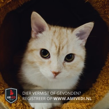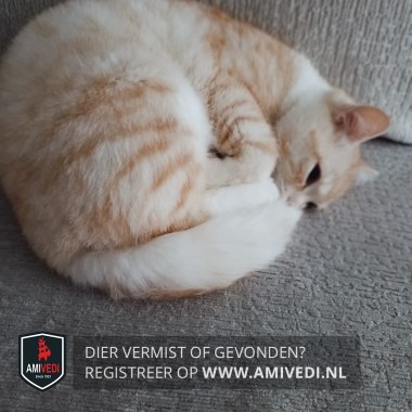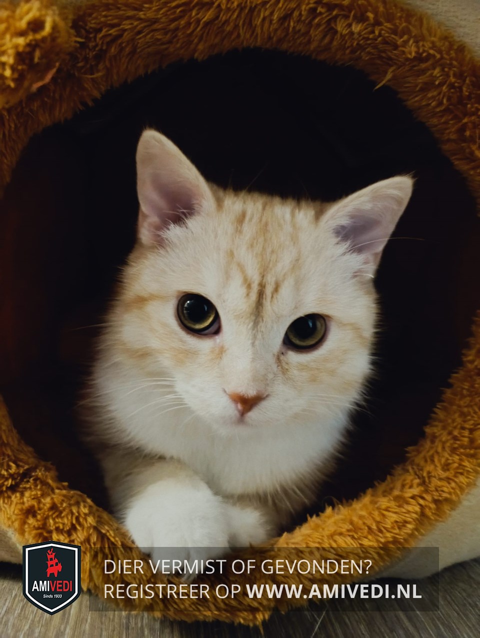 | Signalement | Wit/beige cyperse kater. Licht cypers gestreept kopje. Cyperse strepen op het petje en voorhoofd. Lichter rondom neusje. Witte kin, bef en borst. Licht cypers gestreept wit/beige/oranje lijfje en pootjes. Witte voetjes aan de voorpoten. Witte kniekous aan de rechterachterpoot. Volle witte staart met oranje kleuring op de bovenzijde. |