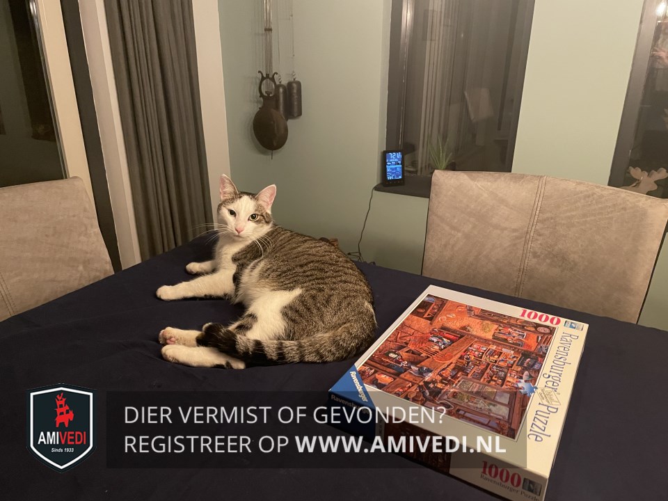 | Signalement | Cypers grijs/zwart met wit. Wit kopje met grijs/zwart rondom de oren. Witte neus, snoet, kin, bef, borst, buik en poten. Cyperse vlek op de linkerachterpoot. Laatste stuk van de staart is bijna zwart met een klein wit puntje. |