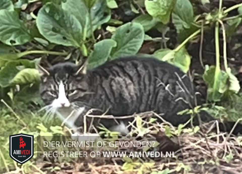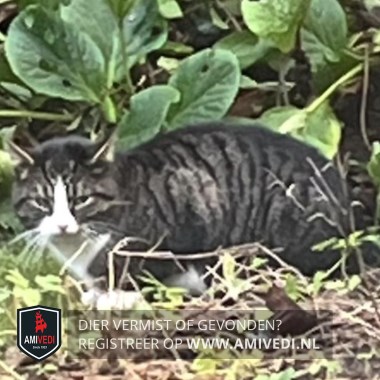 | Signalement | Cypers bruin/grijs/zwarte kat. Witte neusbrug, wit rond het bekje. Wit befje en wat wit op de buik. Witte sokjes. |