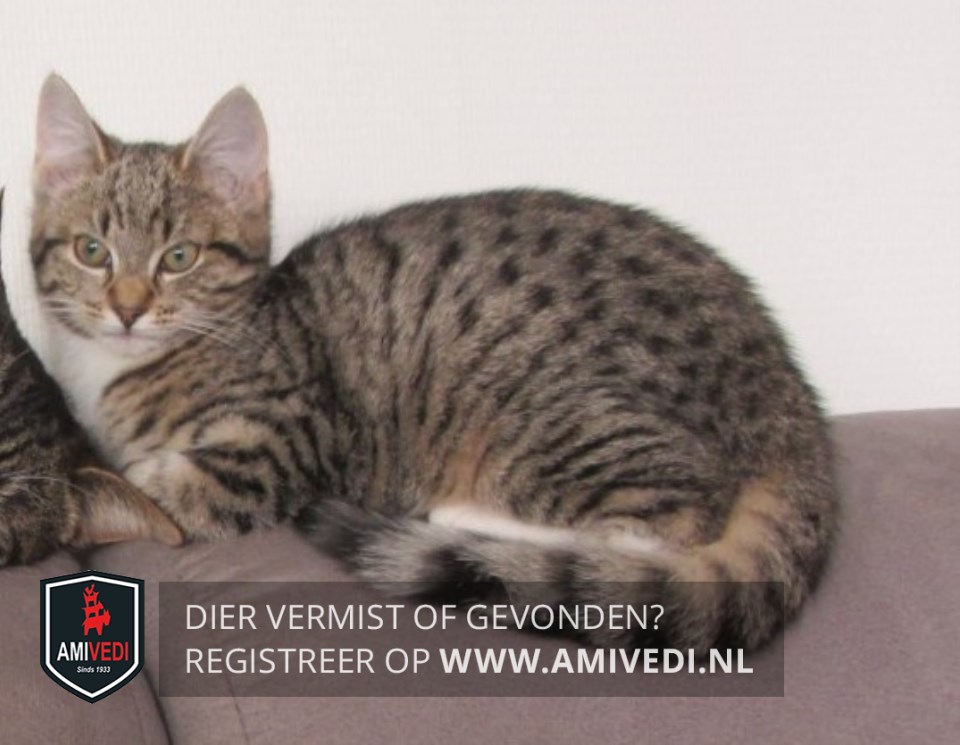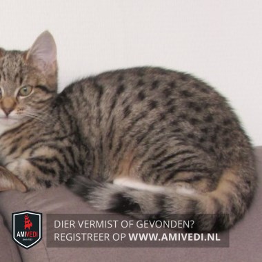 | Signalement | Geheel cypers bruin/zwart gestreept met wit rond de mond een witte kin, en bef. Linker achterpoot lijkt wit. |