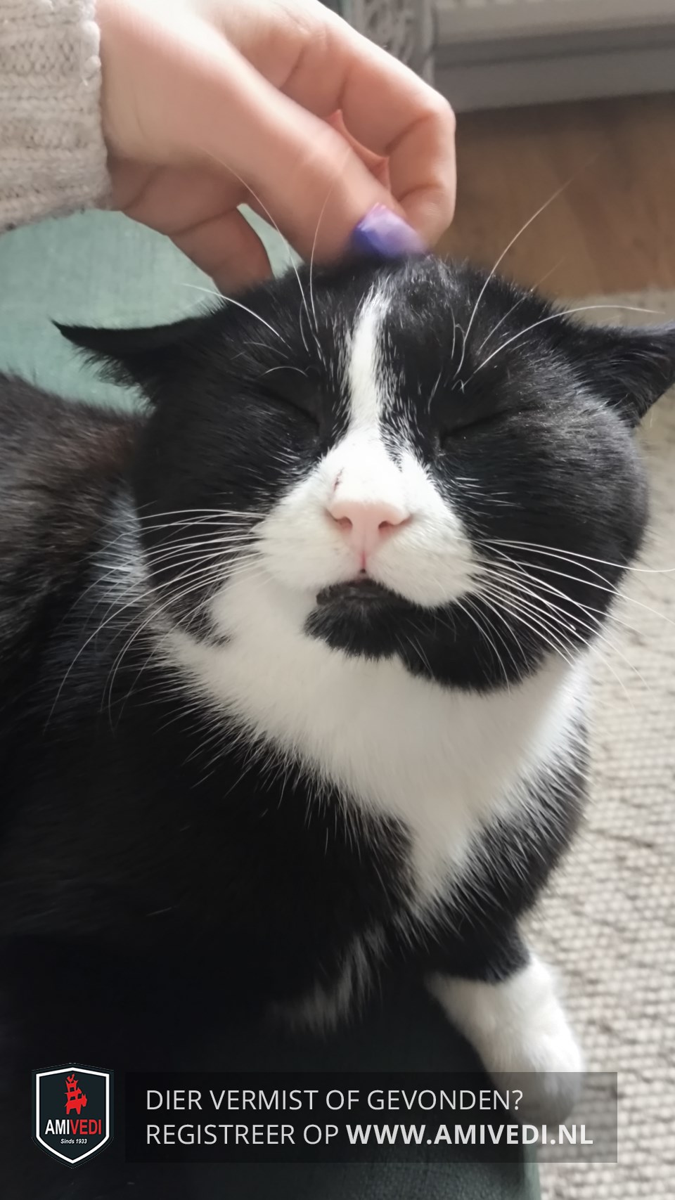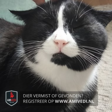 | Signalement | Overwegend zwart met witte accenten: wit streepje over de neusbrug dat naar beneden breed uitloopt; witte vlakken links en rechts van de neus; de kin is links tot langs het midden zwart en rechts wit; witte hals enbef, doorlopend in een smal streepje naar weer breder wit vlak op borst en buik. Linkervoorpoot witte sok |