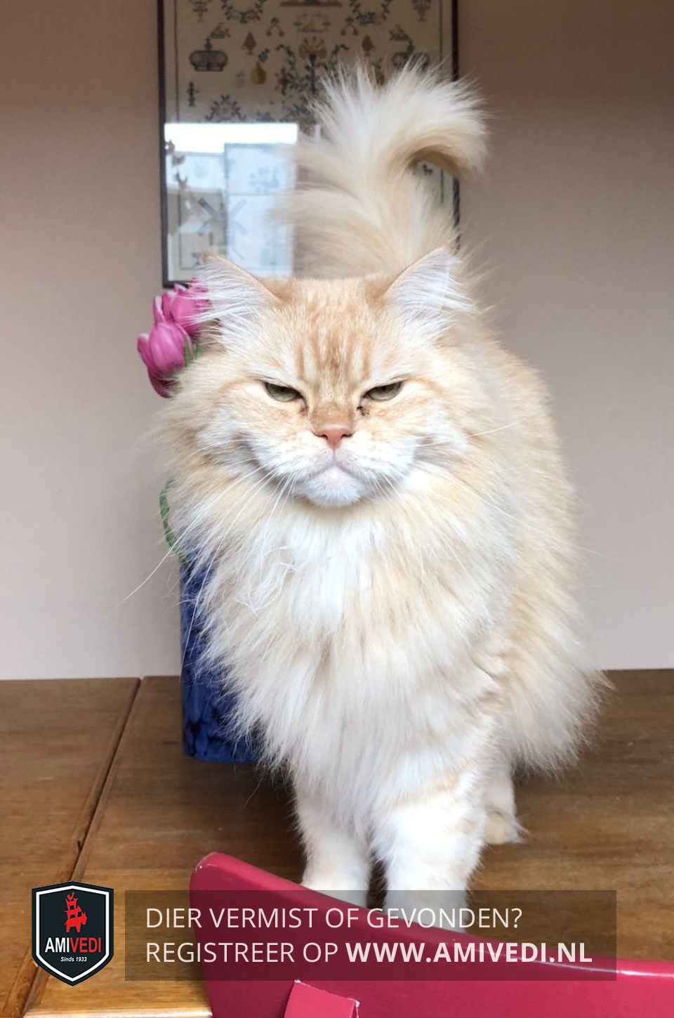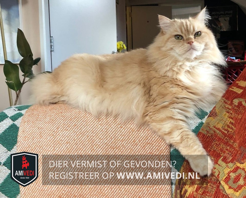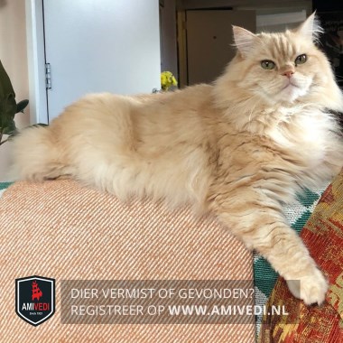 | Signalement | Beige/wit/rossig met lang, pluizig, blond haar. Groene ogen. Licht rossig. Pluizige poten. Dikke pluimstaart. Stumpie kan niet goed tegen voedsel waar graan in zit. Hij is buiten niet gewend. |