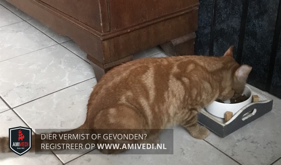 | Signalement | Cypers gestreept petje en oren. Knipje in het rechteroor. Rode bles, amberkleurige ogen, roze neus, witte snorharen. Voorpootjes rood gestreept. Rug, flanken en dijen geheel rood/oranje gemarmerd. Ringstaart. |