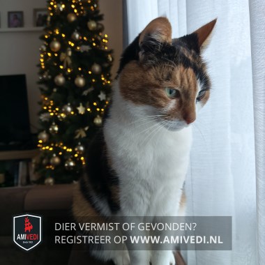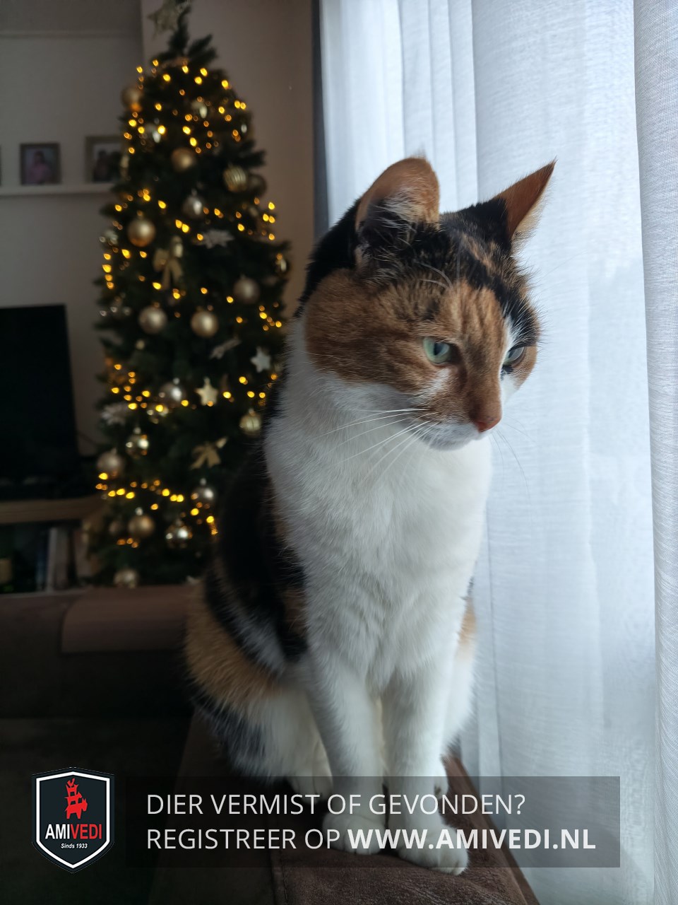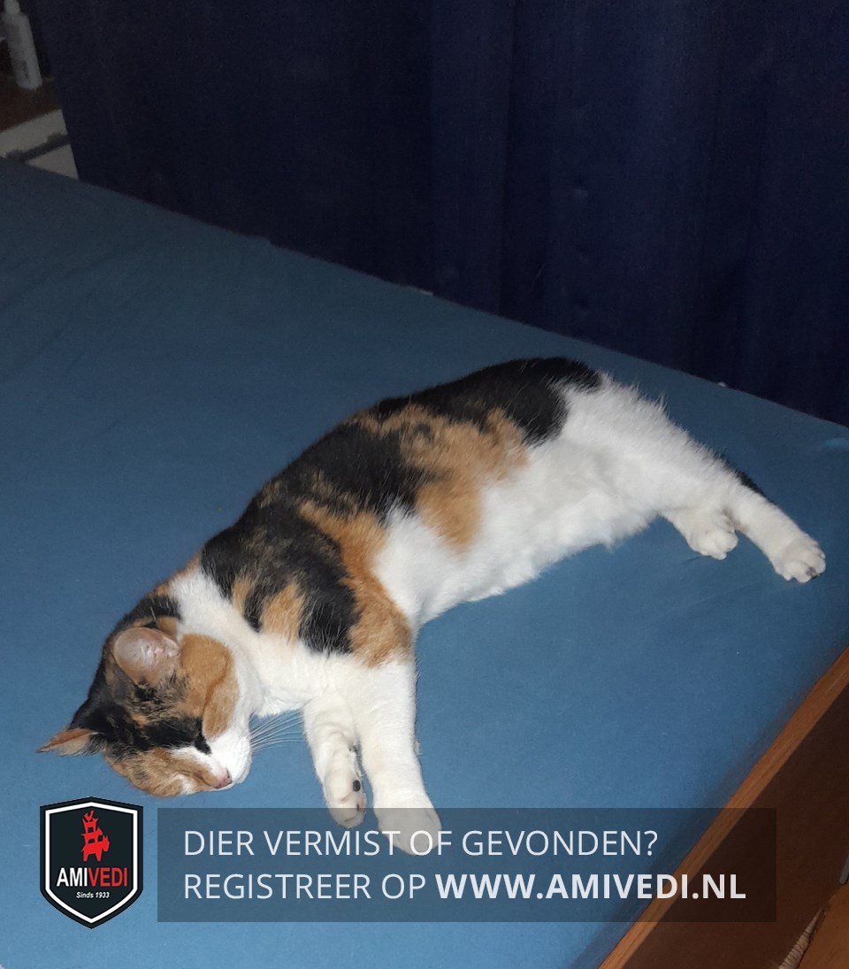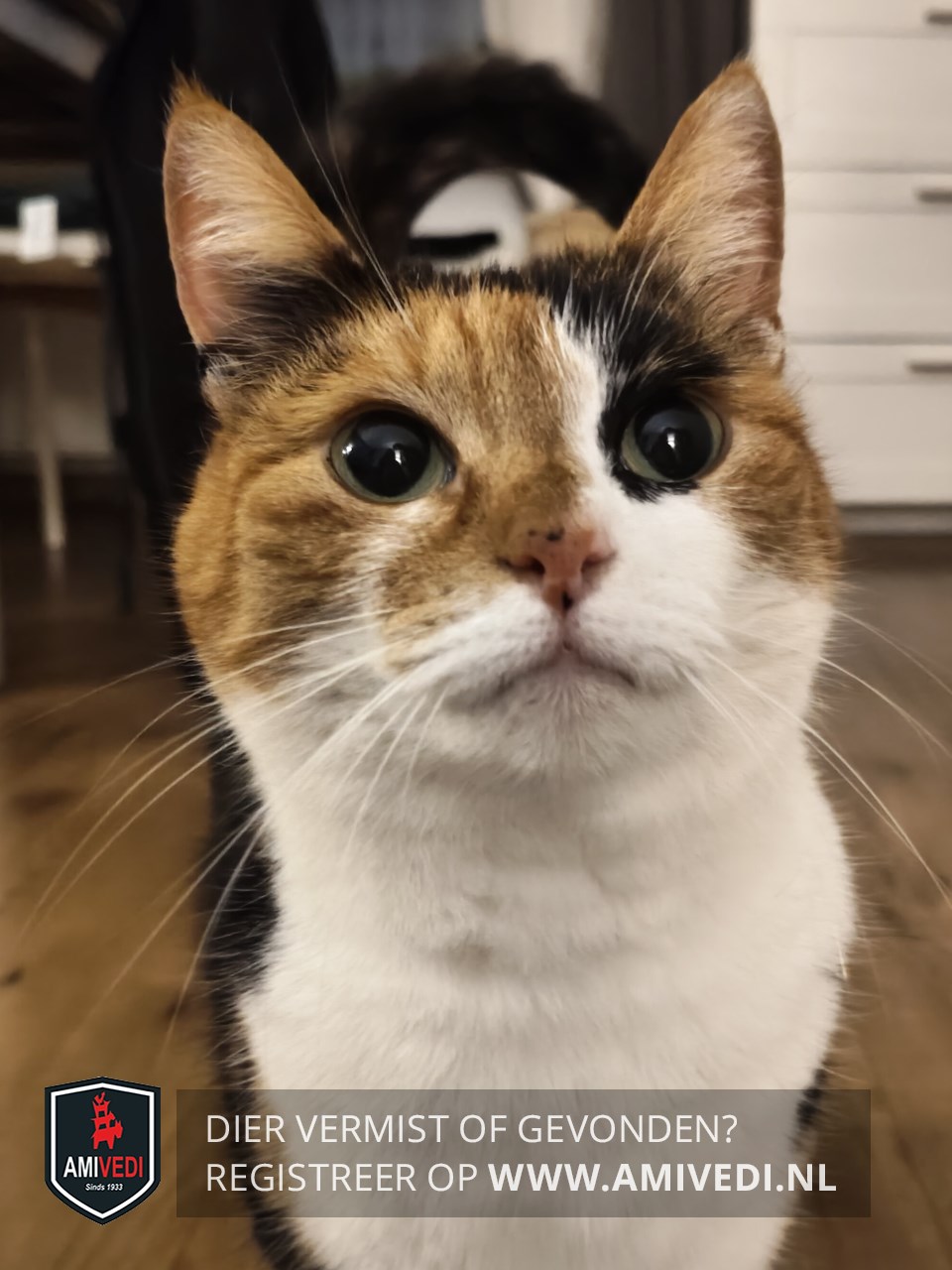 | Signalement | Lapjes poes. Rode bles met links naast het oog een wit streepje. Zwart stipje op het puntje van de neus. Boven het linker oog zwart. Rechts bij de snorharen rood met wit, links wit. Rode oortjes. Onderlichaam is wit, op de kop, rug en staart zwart met rood gevlekt. |
