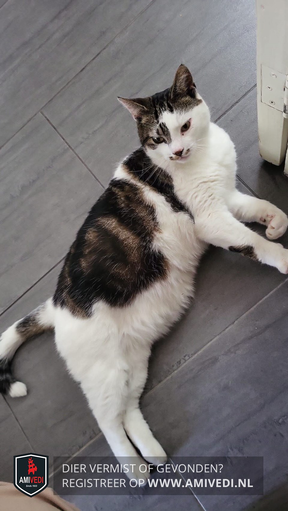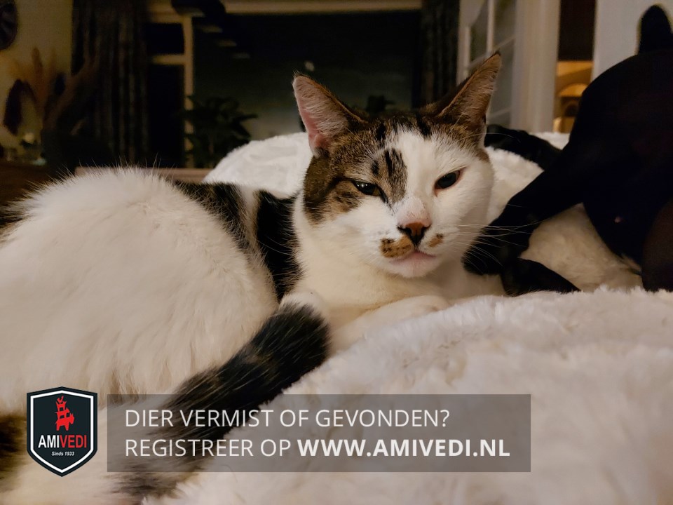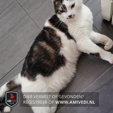 | Signalement | Wit met beige/ bruin en zwart gevlekt. Witte snuit met vlekjes weerzijden naast neus. Boven en rond rechteroog beige/ zwart, donkere ring om rechter oog en linker oog is alleen witte vacht. Boven ogen en oren beige/ bruin/ zwart gestreept. Op rug beige/ bruin/ zwart gemarmerd. Staart is wit met grijs/ beige/ zwart en witte punt. |