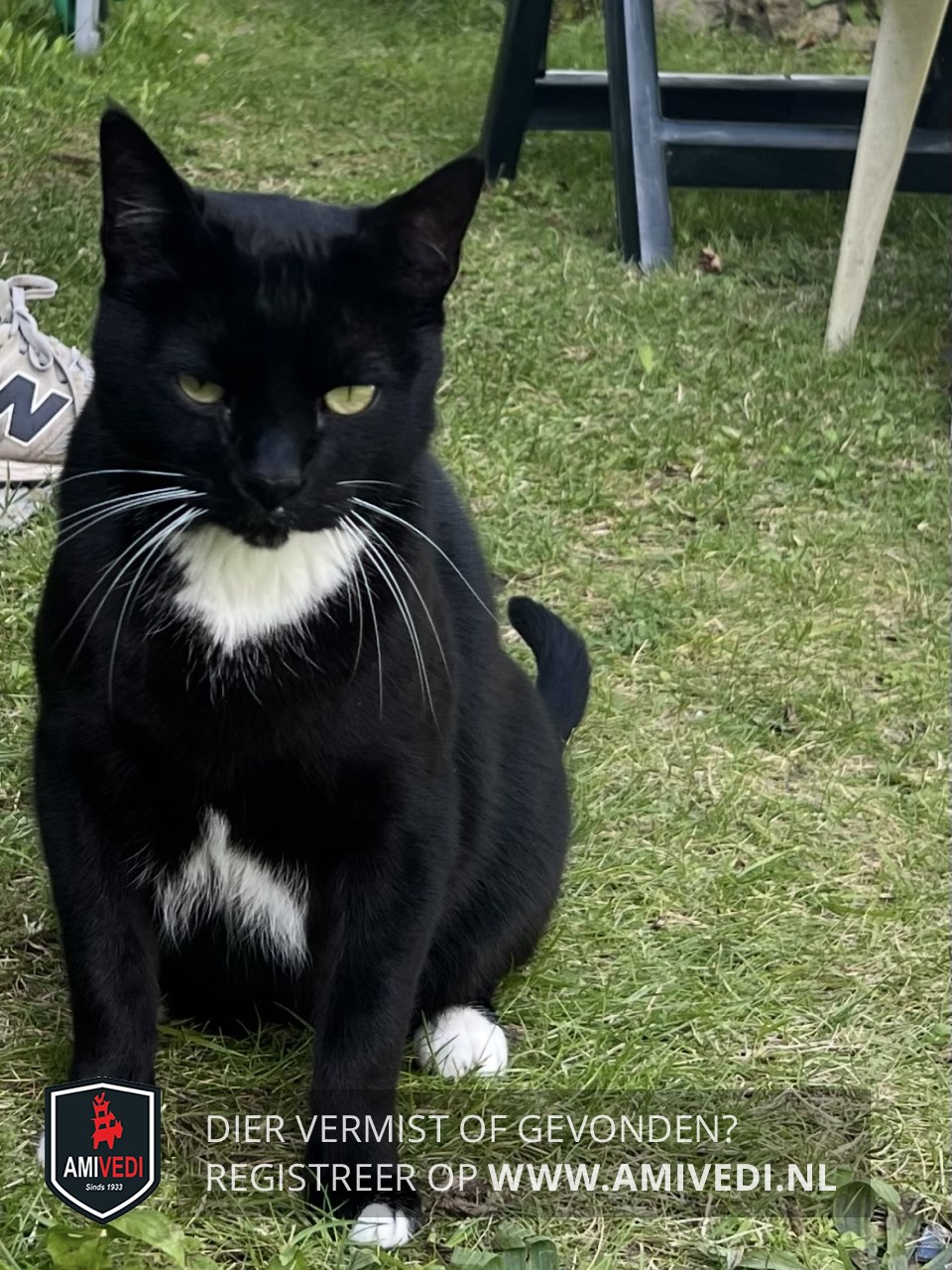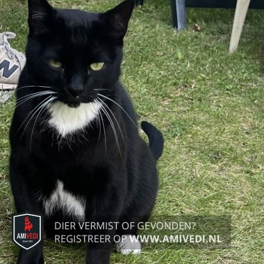 | Signalement | Zwarte kat met een beetje wit op het borstje en de pootjes zijn wit |