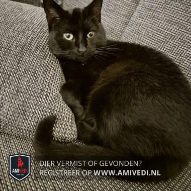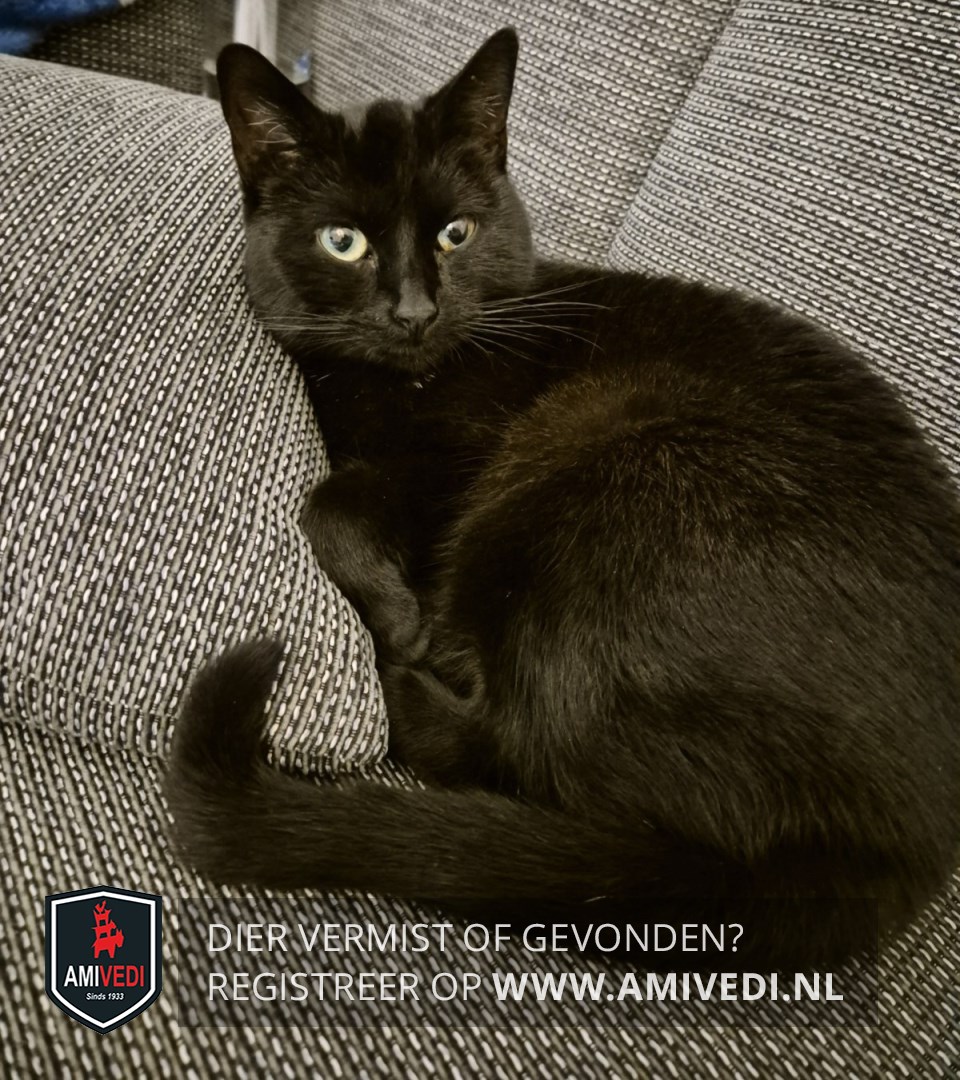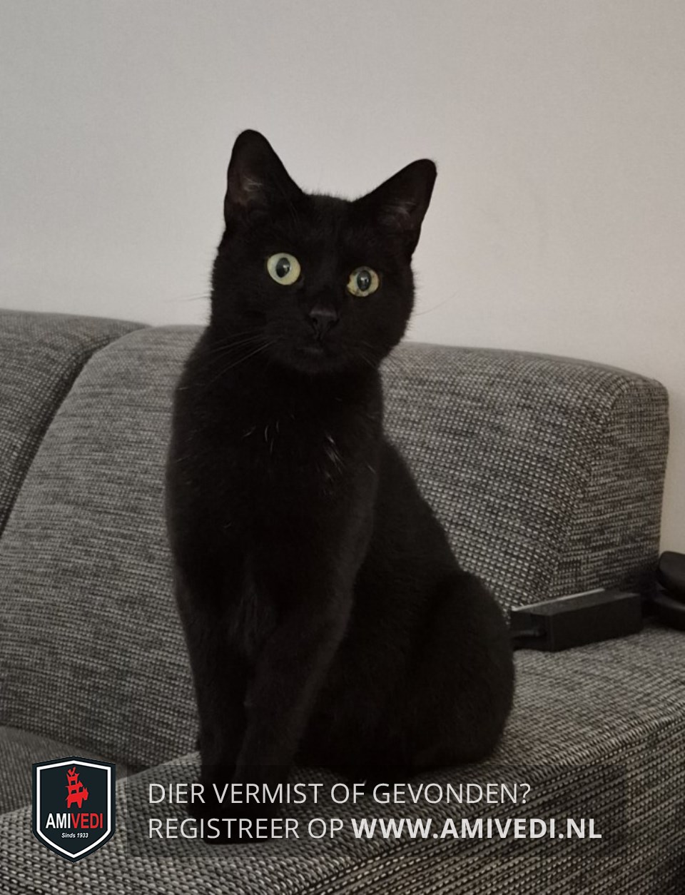 | Signalement | Egaal zwarte poes met hier en daar een paar witte haartjes in de vacht. Ook heeft ze een kale plek onder haar kinnetje. |