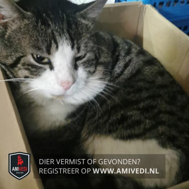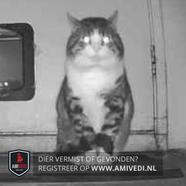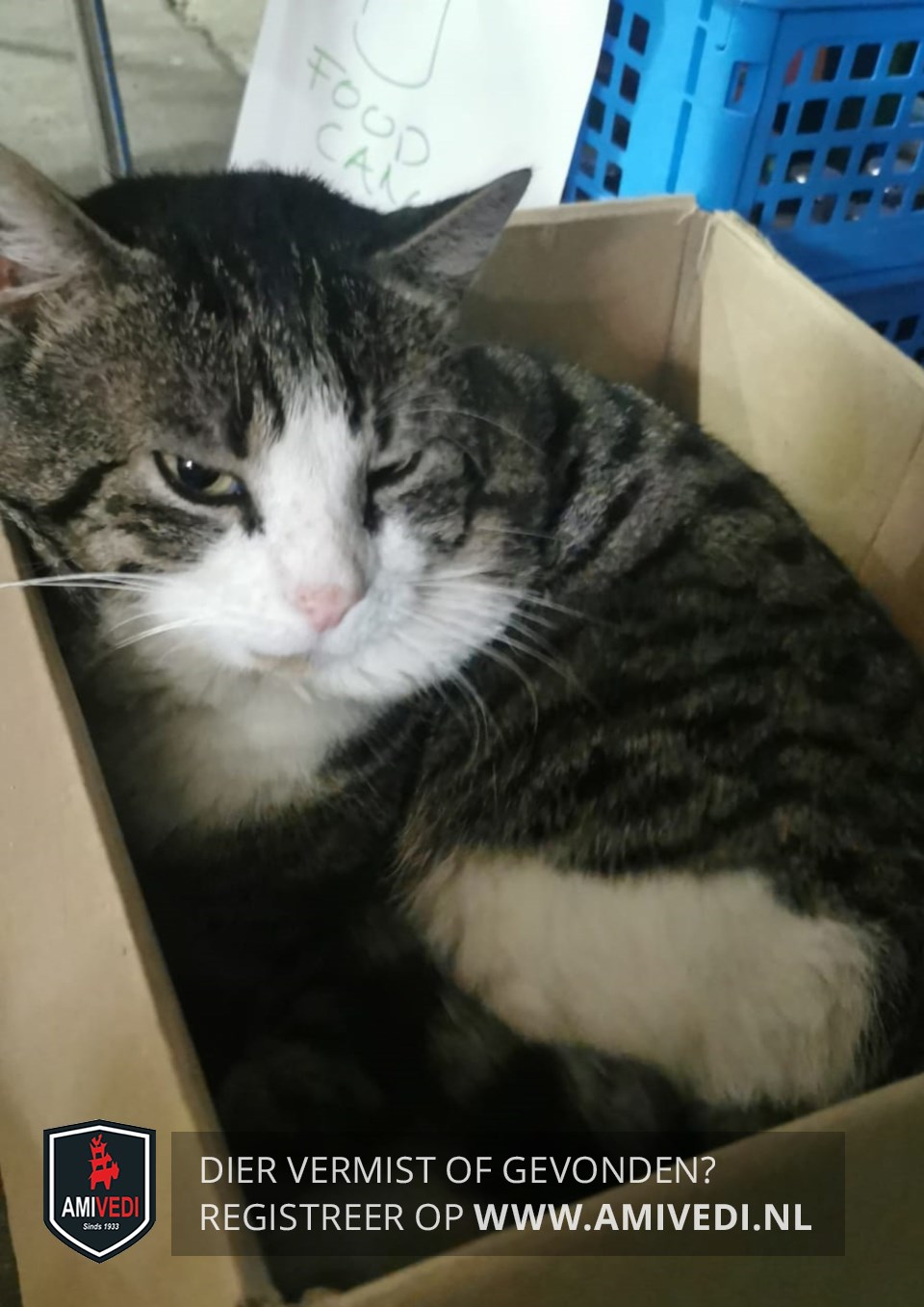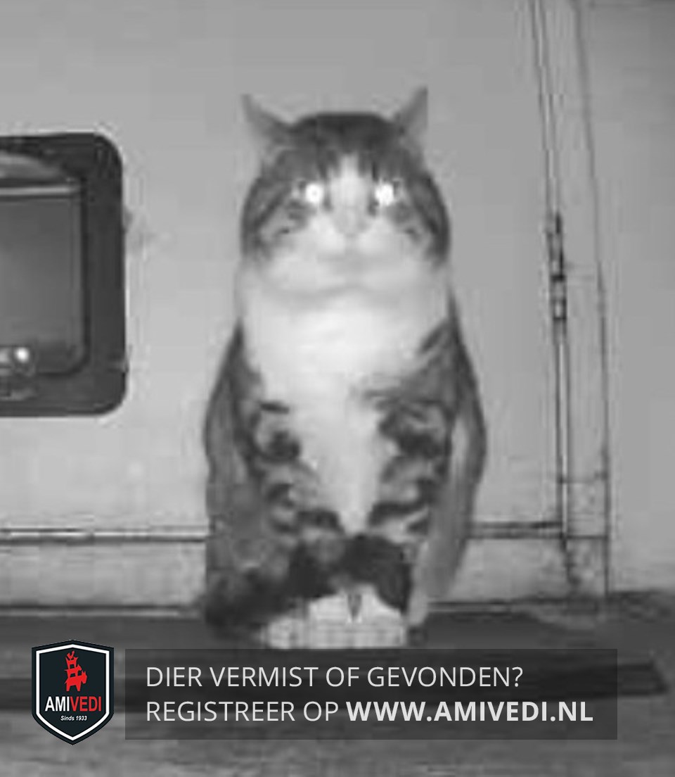 | Signalement | Cypers grijs/bruin/zwarte ongecastreerde kater. Het cypers loopt door over en langs de oogjes. Witte neusbrug, roze neuspunt en wit rond het bekje. Witte nek/hals, brede witte V-bef. Wit op de buik en linker heup. Voorpootjes witte sokjes, witte achterpootjes. Enorm bolle wangen, klein buikje. Zwart geringde staart, zwarte staartpunt. |