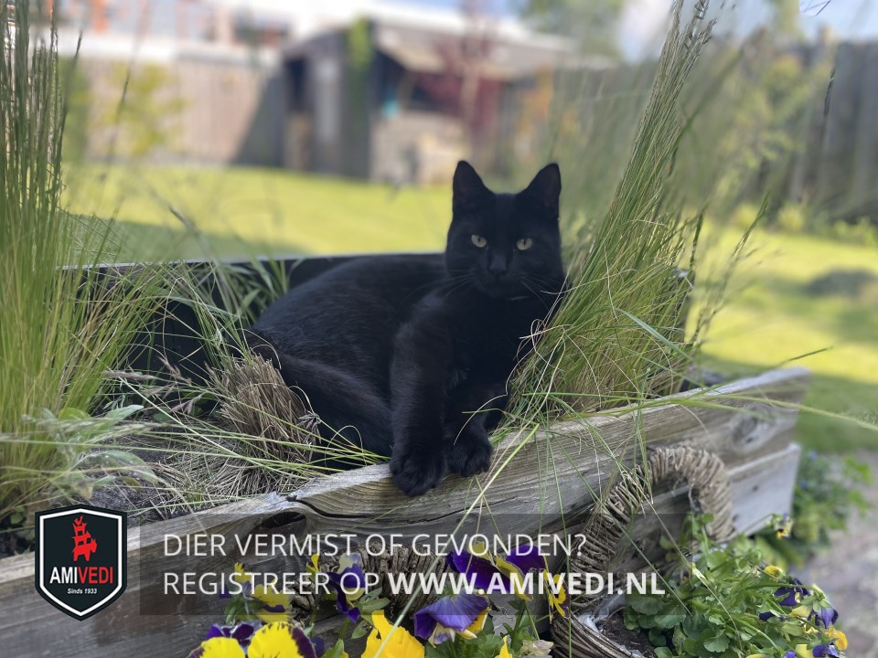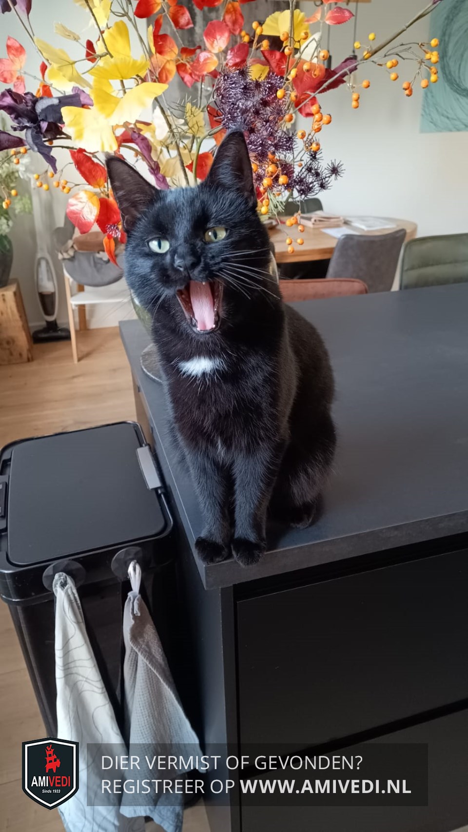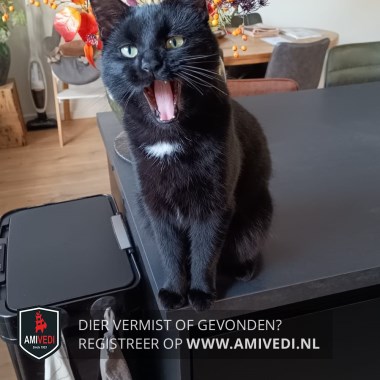 | Signalement | Volledig zwart met een witte vlek op de borst |
