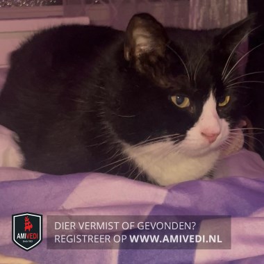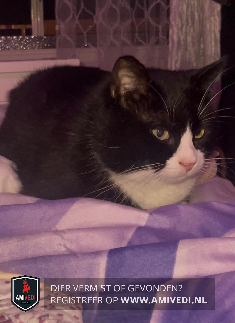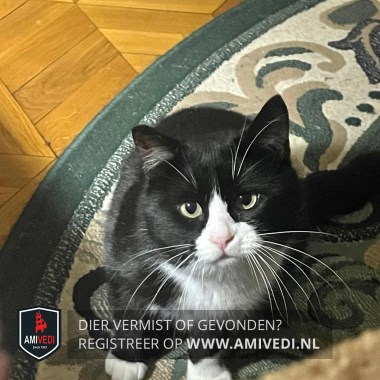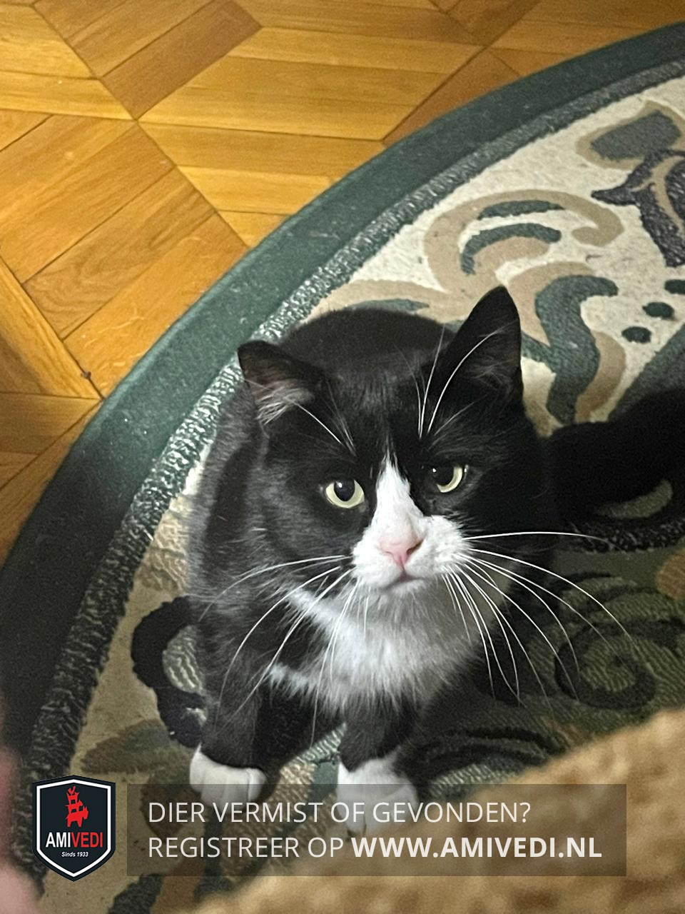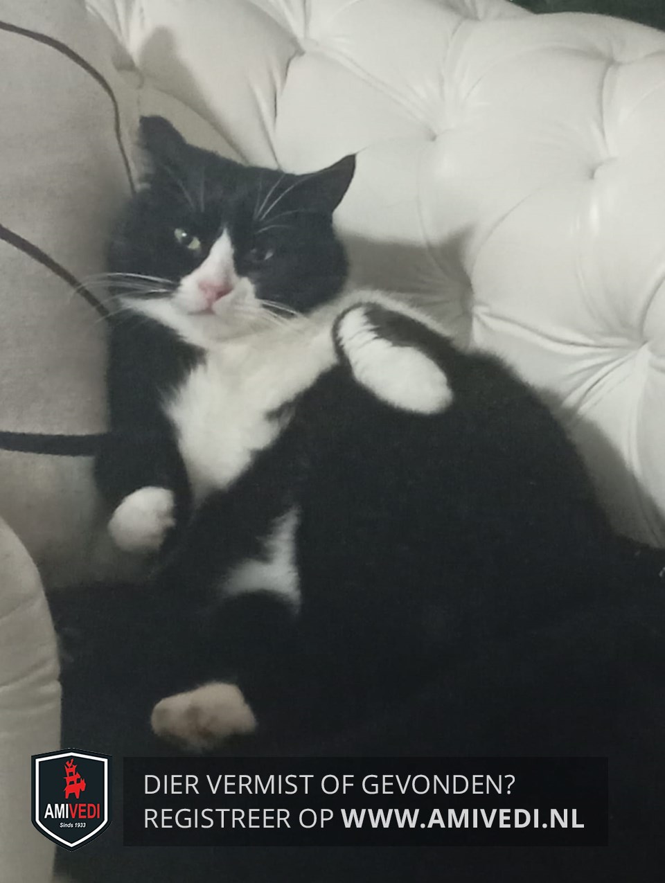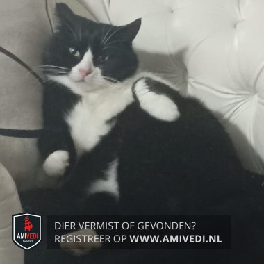 | Signalement | Heeft wel kort haar heeft maar een hele dikke vacht. En hij mist een stukje van zijn oor. Zwart wit. |